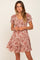 A printed dress featuring a smocked bodice, a v-neckline, short puff sleeves, and a tiered skirt.