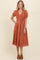 Rust Smocked V-Neck Puff Sleeve Midi Dress