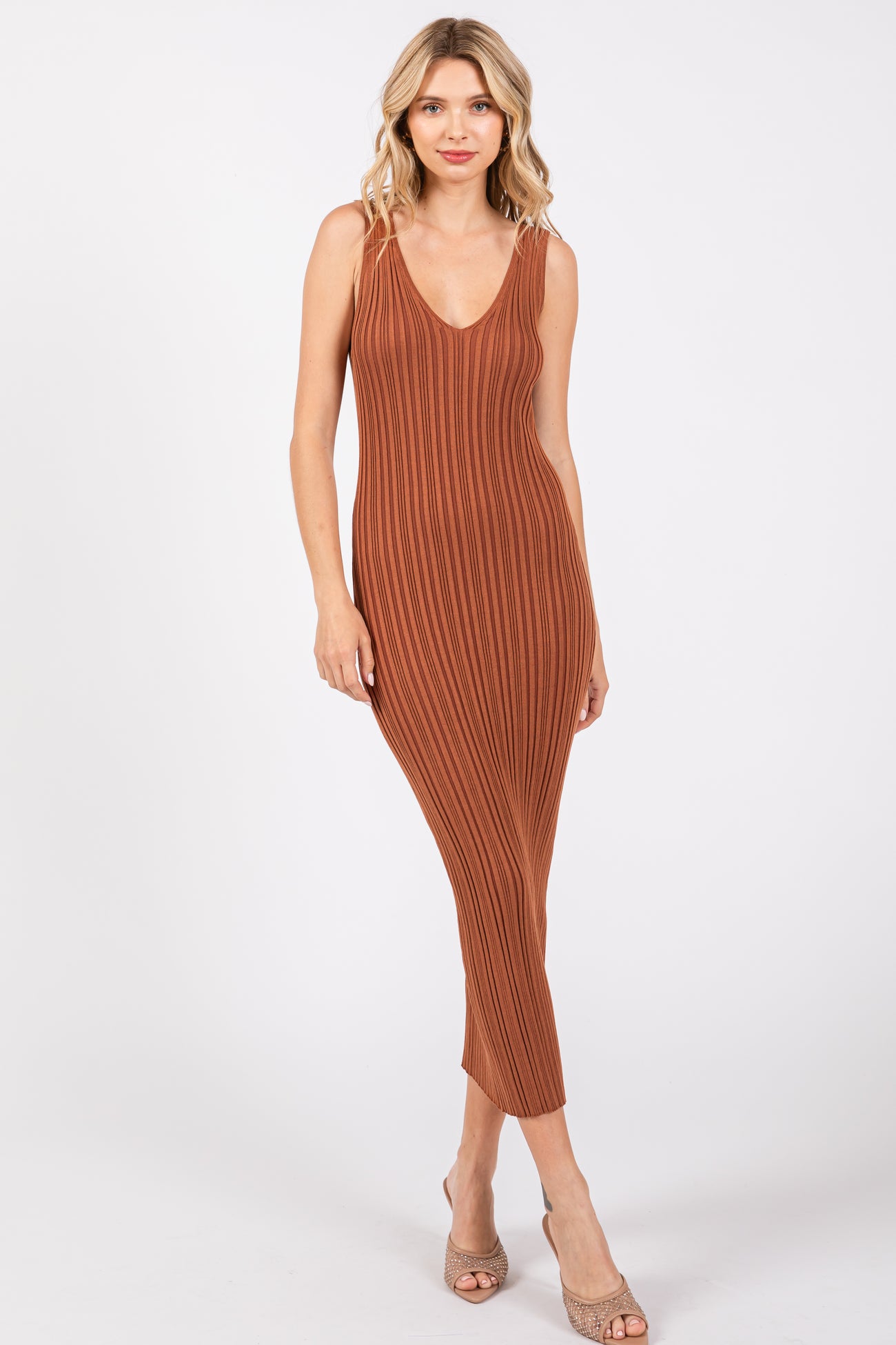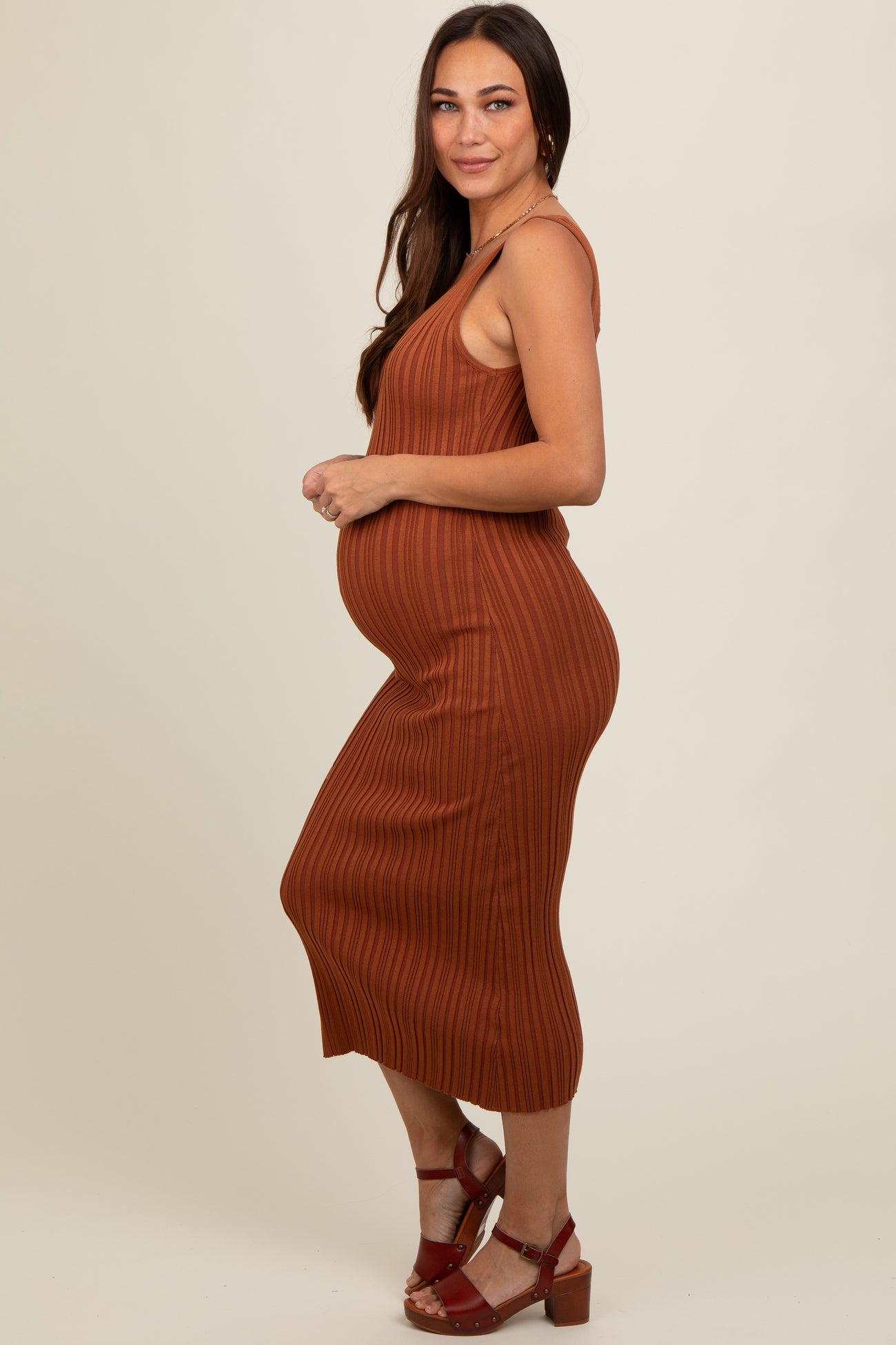 Rust V Neck Sleeveless Knit Maternity Midi Dress