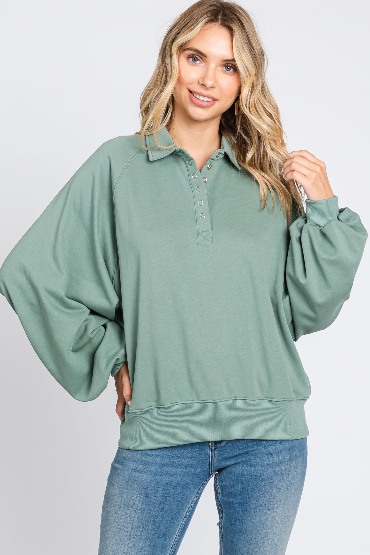 A solid pullover featuring long sleeves, front snap buttons and a collared neckline.