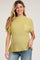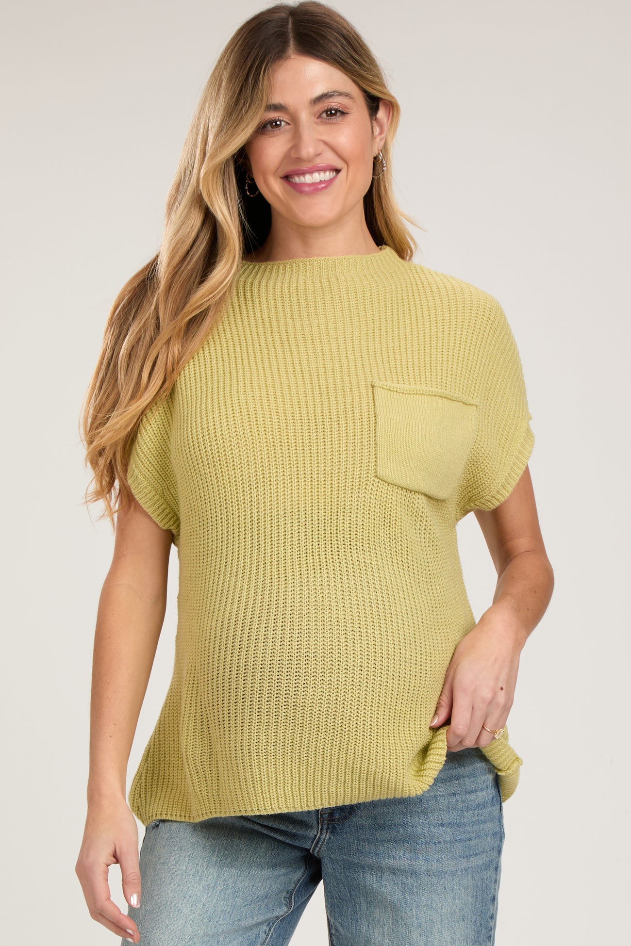 A solid knit maternity top featuring short sleeves, a front pocket and a rounded neckline.