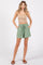 A pair of linen shorts with an elastic waistband, a drawstring tie with metal tip accents, and side pockets.