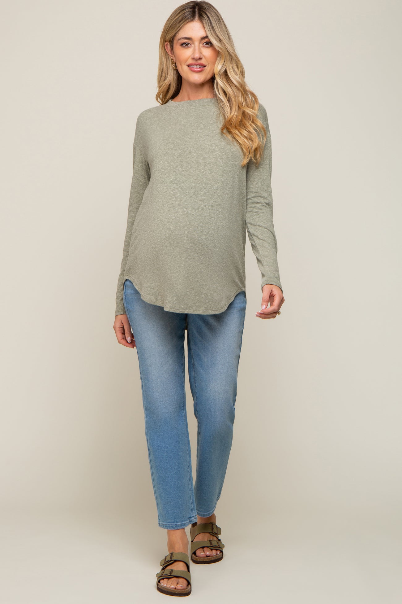 A heathered maternity top featuring long sleeves, a curved hem and a rounded neckline.