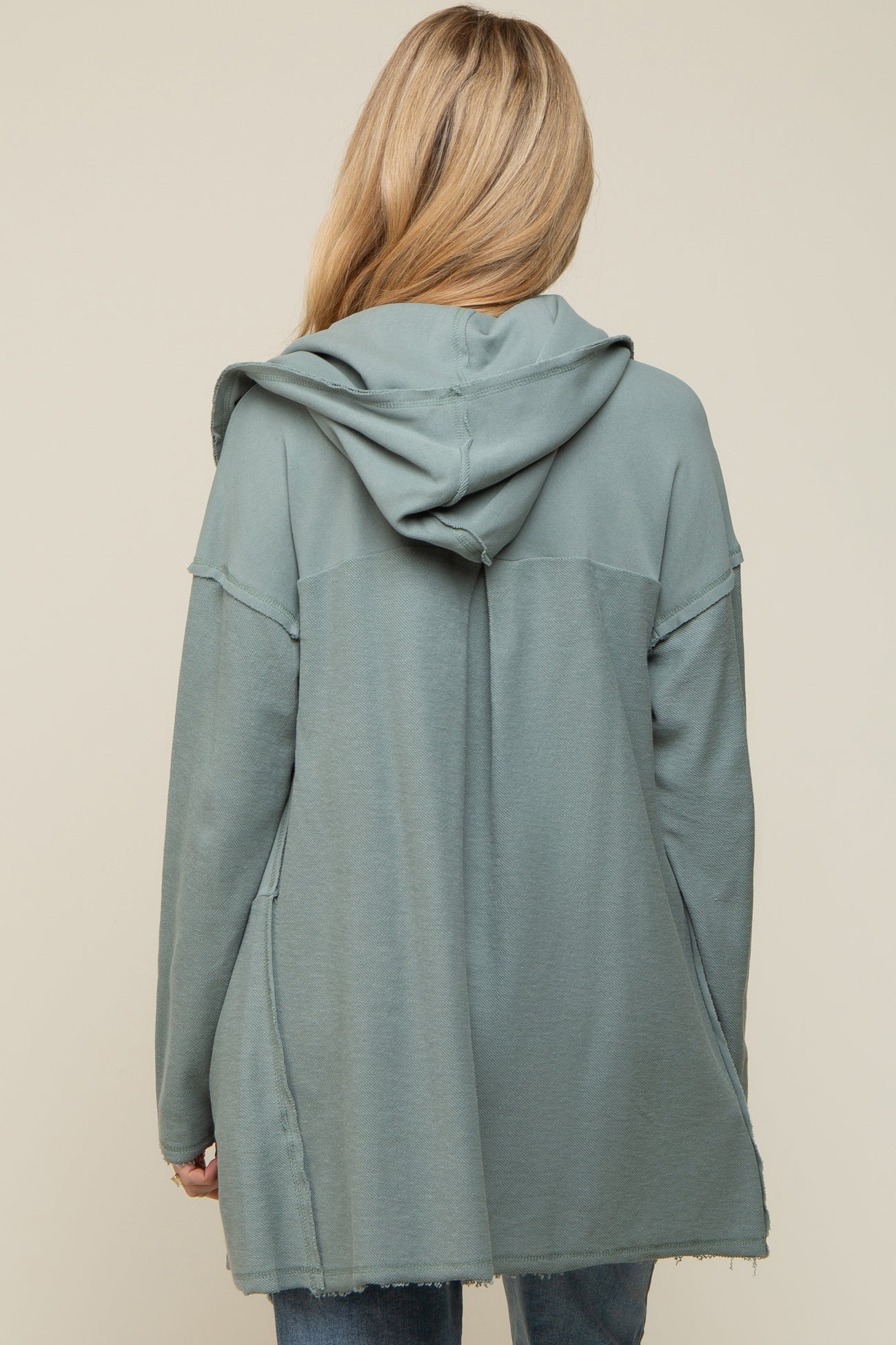 A solid hue maternity cardigan features an open front, exposed seams, front pockets, a raw hem, and a back hood.