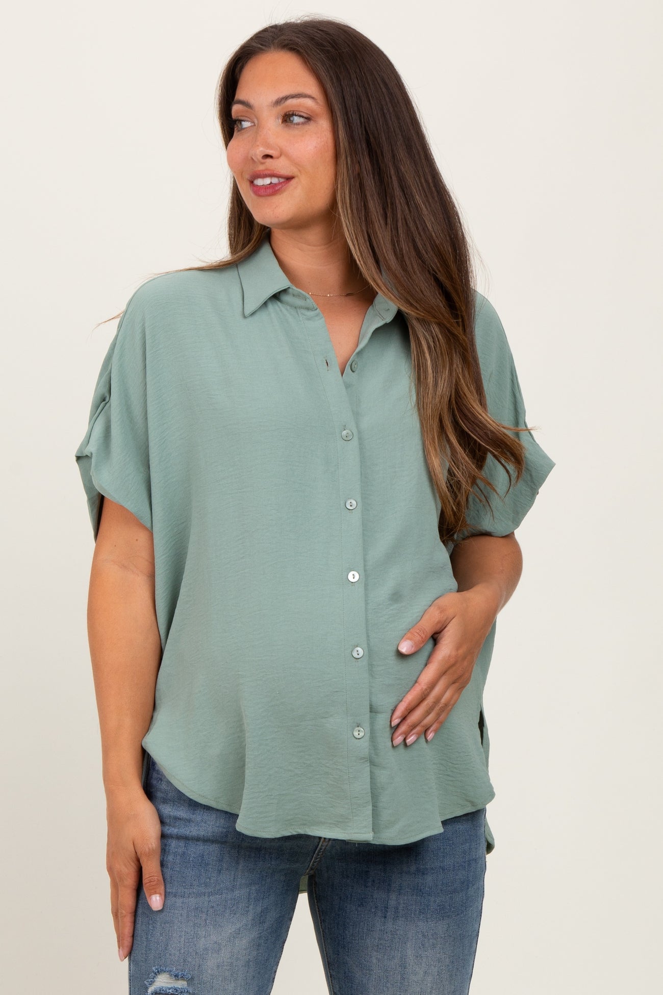 Sage Solid Collared Button-Up Maternity Top