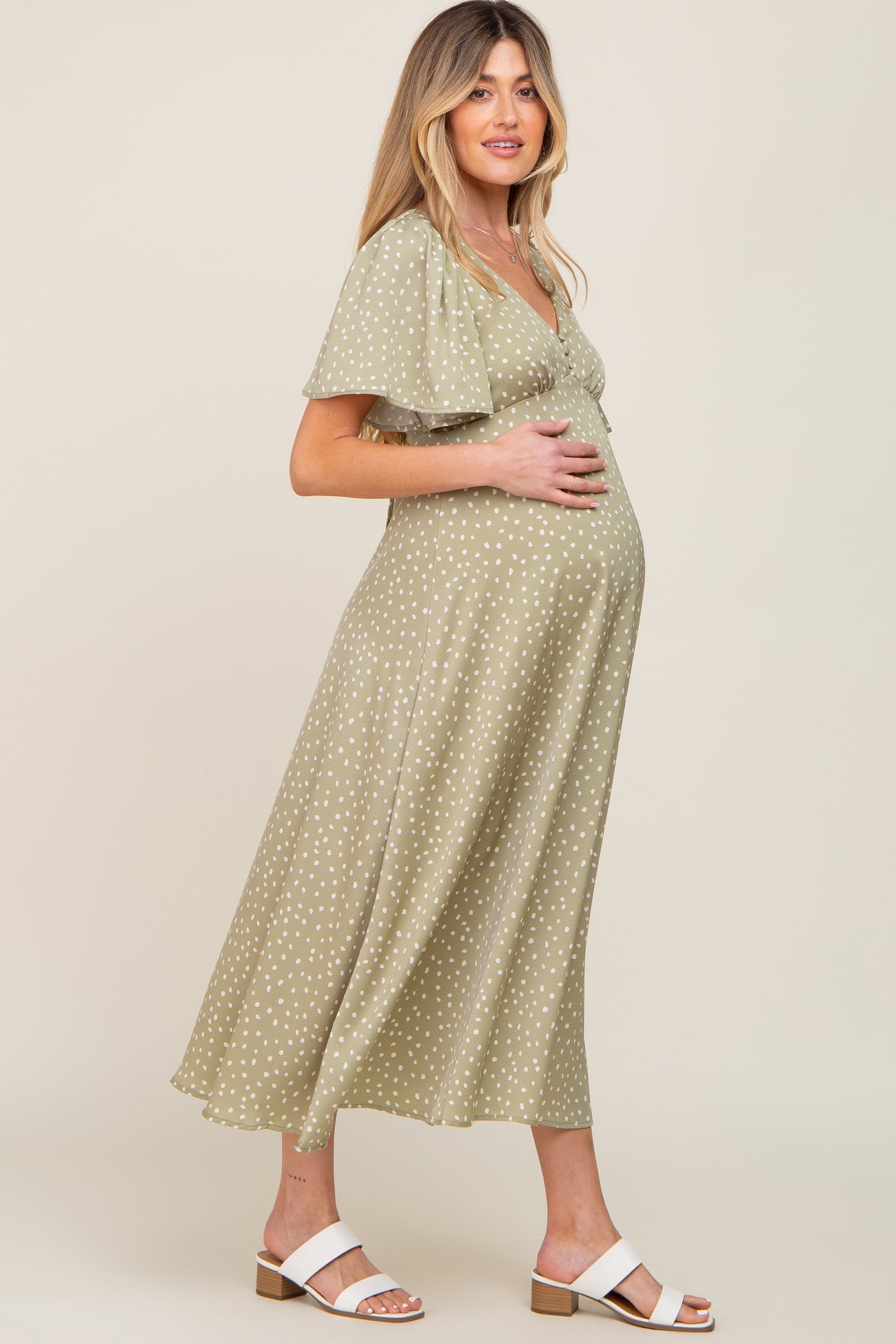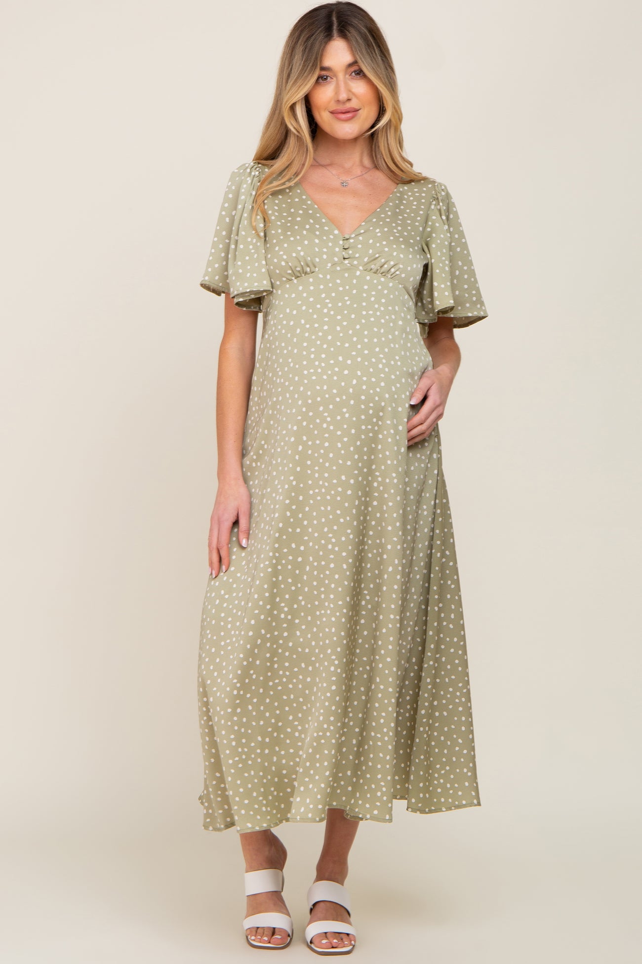 Sage Speckled Button Front Maternity Midi Dress