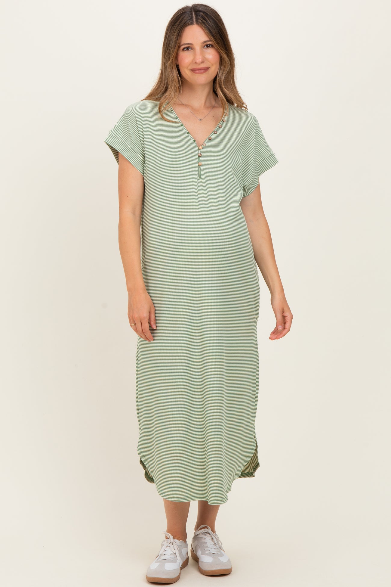 Sage Striped Button Detail Maternity Midi Dress