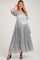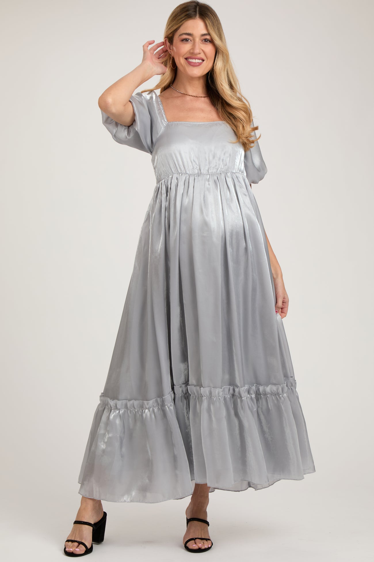 Silver Satin Square Neck Short Puff Sleeve Maternity Maxi Dress