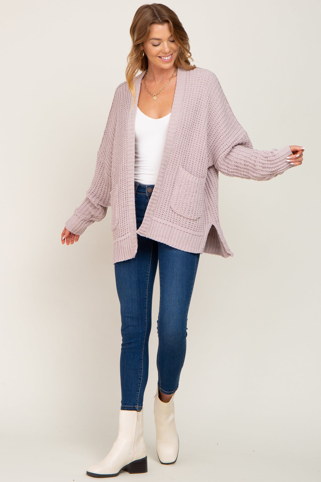 A super soft chunky knit cardigan in an oversized fit with an open front, two front pockets and two side slits.