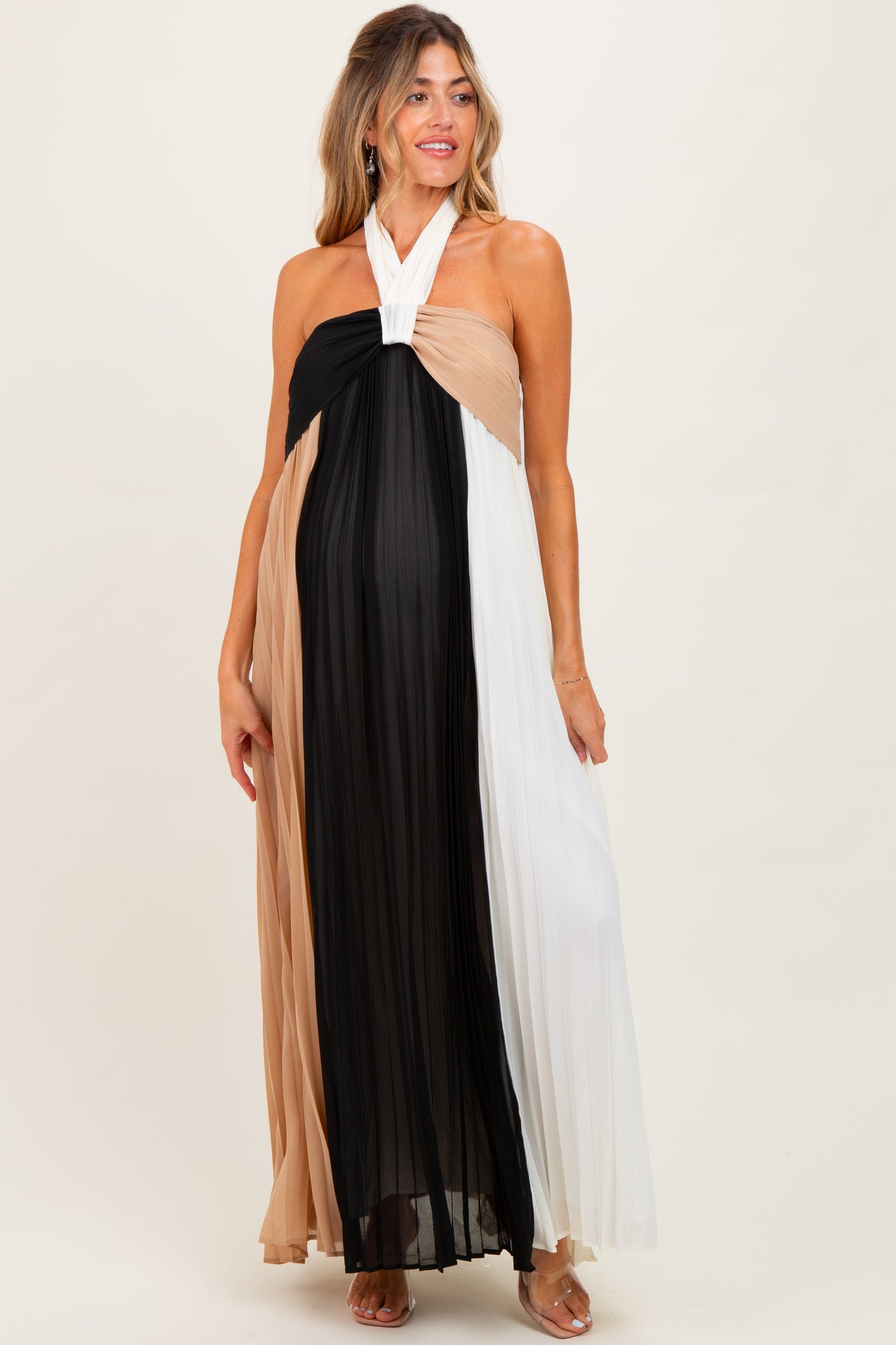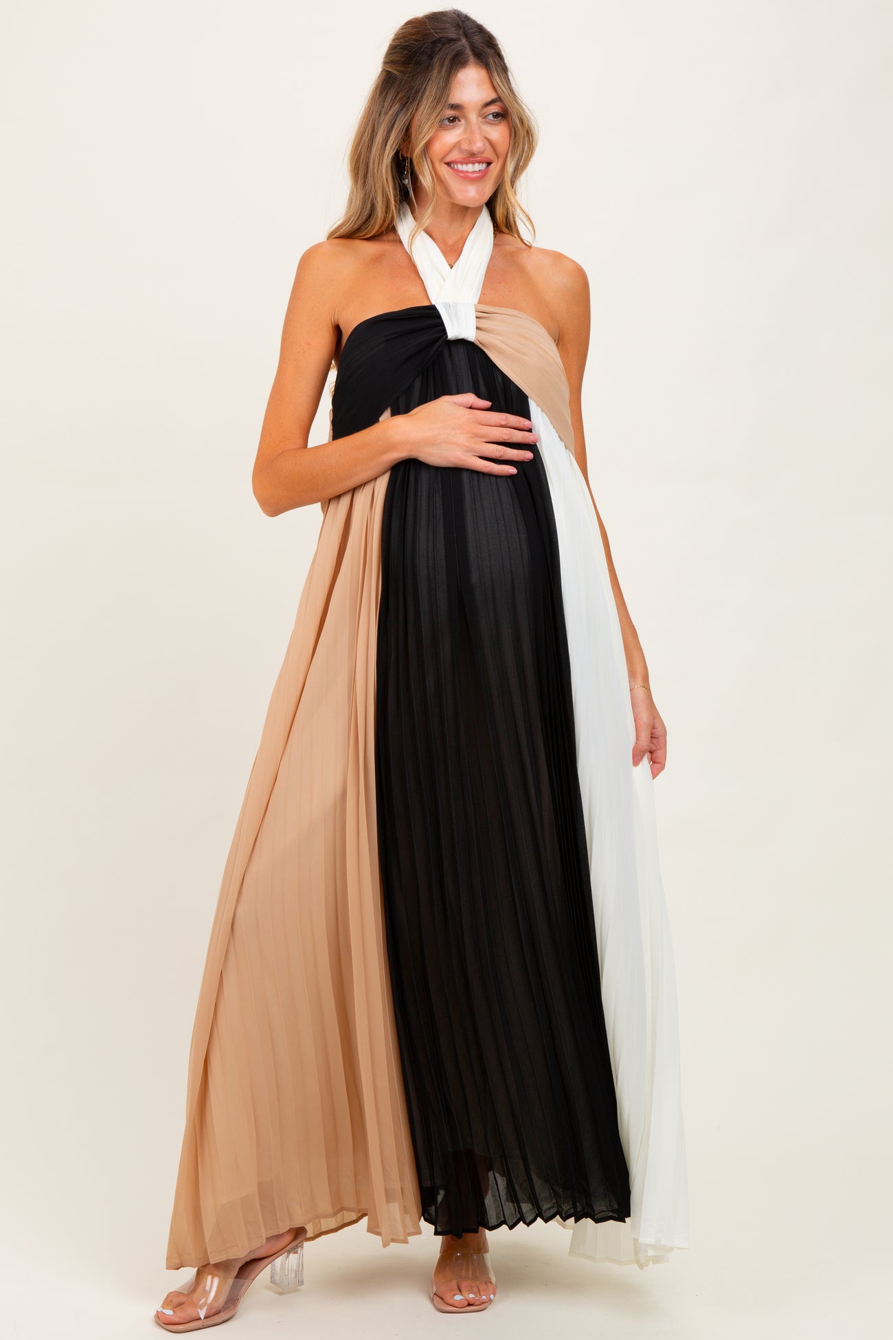 Taupe Colorblock Pleated Halter Neck Maternity Maxi Dress