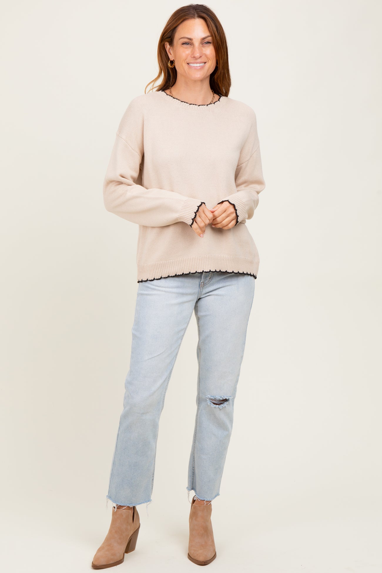 Elevate your casual wardrobe with our Taupe Contrast Scallop Trim Sweater. Crafted from a soft knit fabric, this cozy sweater features elegant scallop details along the neckline, cuffs, and hem, highlighted with a subtle black contrast trim for added charm. The relaxed fit and dropped shoulders ensure all-day comfort, while the neutral taupe shade pairs effortlessly with your favorite jeans or skirts. Perfect for layering or wearing solo, this versatile piece brings a polished yet playful touch to any outfit. Stay stylish and comfortable season after season with this timeless sweater must-have.