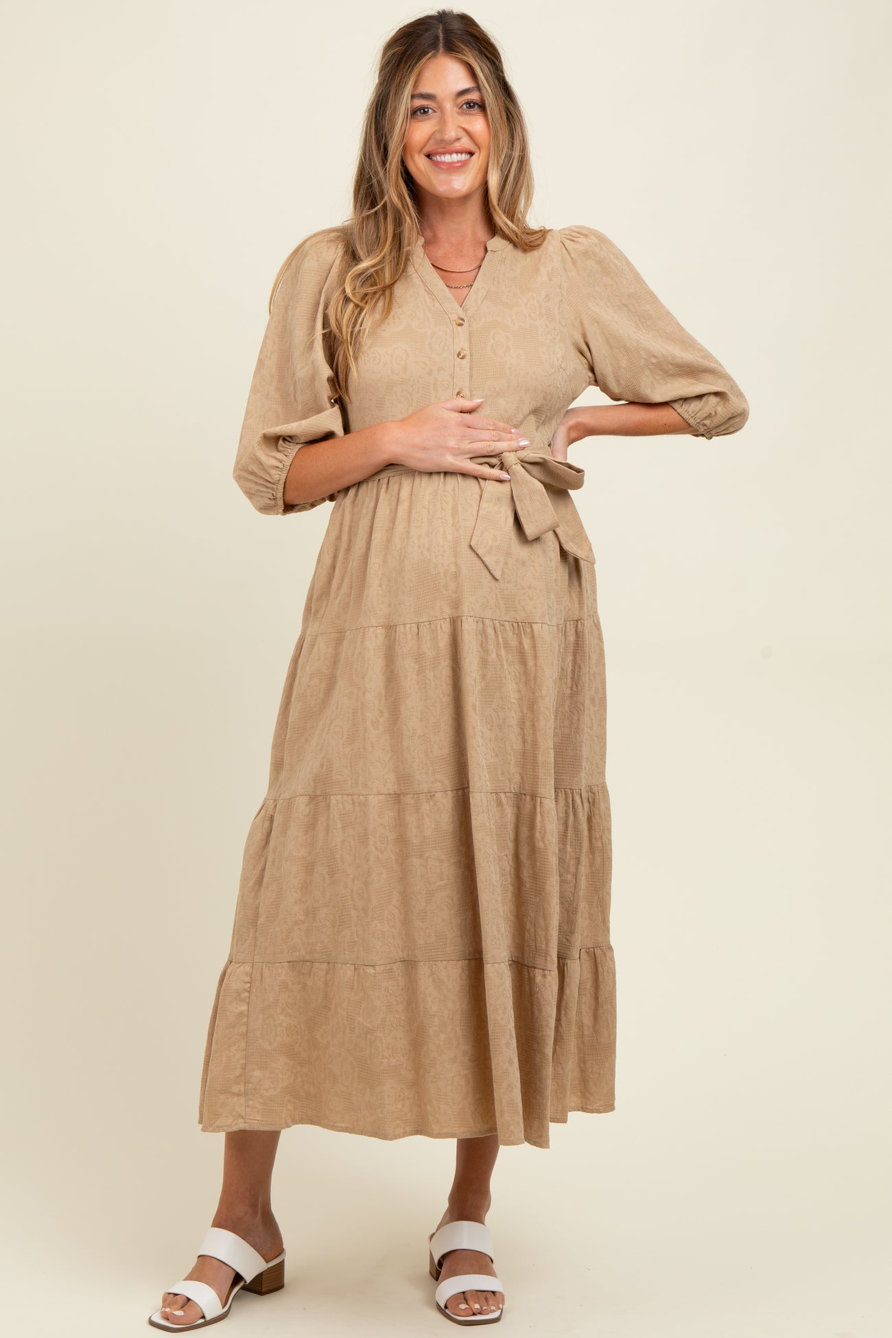 Taupe Floral Jacquard Button Front Tiered Maternity Dress
