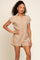 A lightweight, double layered gauze romper. Features front functioning buttons, a collar, short cuffed dolman sleeves, and front pockets.