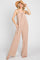 A solid halter neck jumpsuit with a round neckline and cutout self tie closure in back.