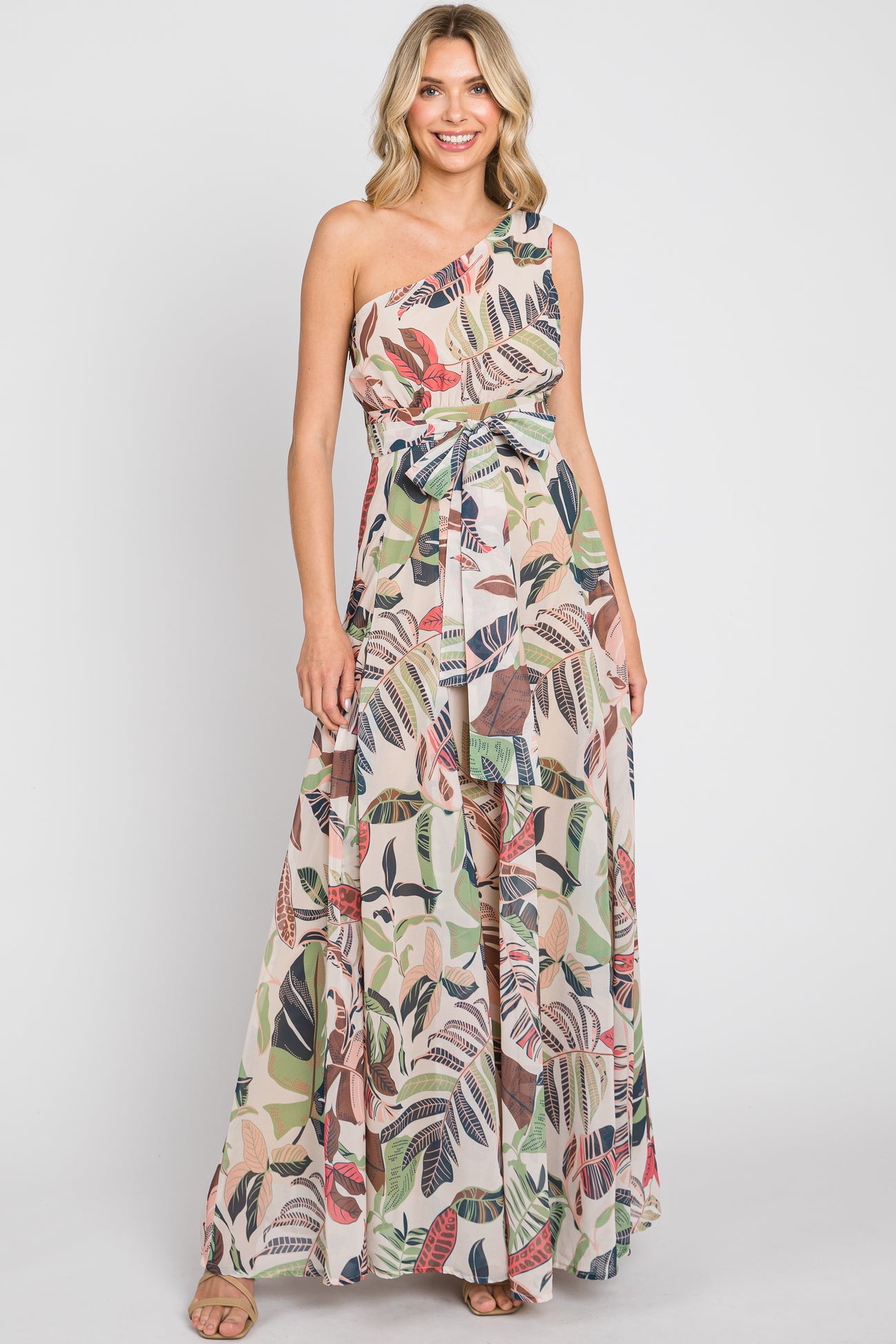 Taupe Leaf Print Chiffon One Shoulder A-Line Waist Tie Maternity Maxi Dress