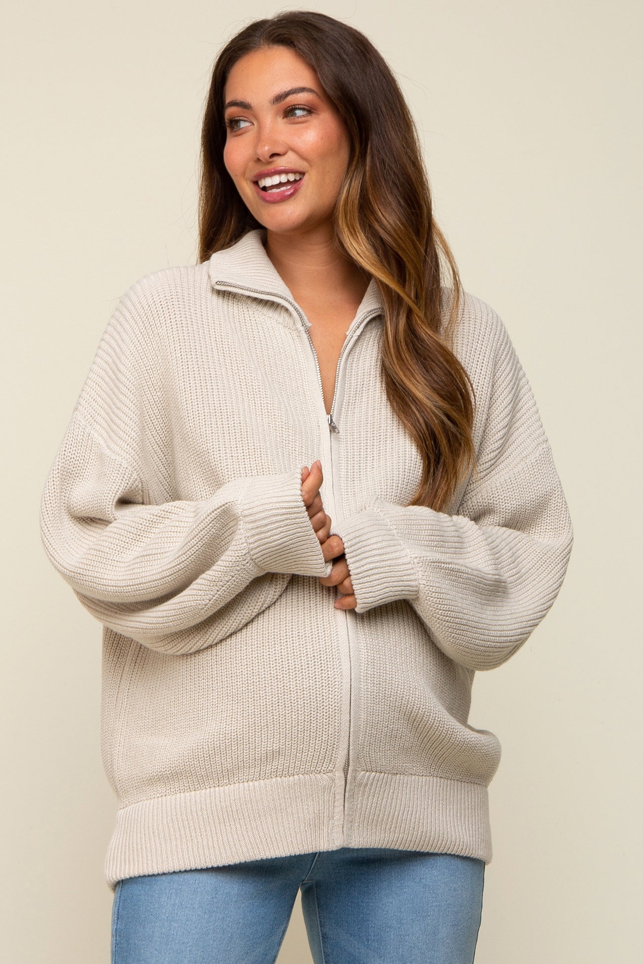 An oversized maternity cardigan featuring a zip up front and long puff sleeves.