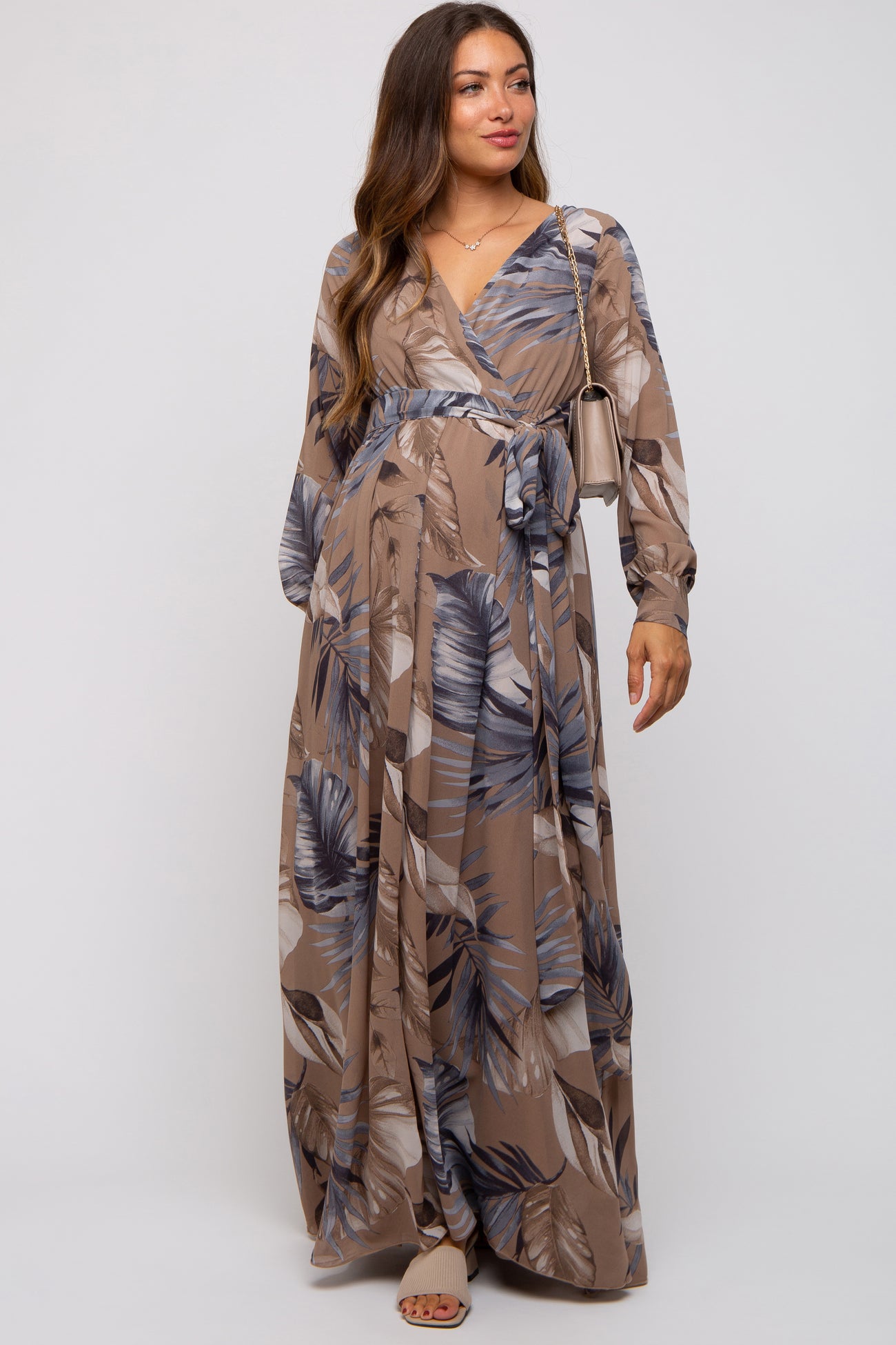 Taupe Palm Print Chiffon Wrap Front V-Neck Long Sleeve Maternity Maxi Dress