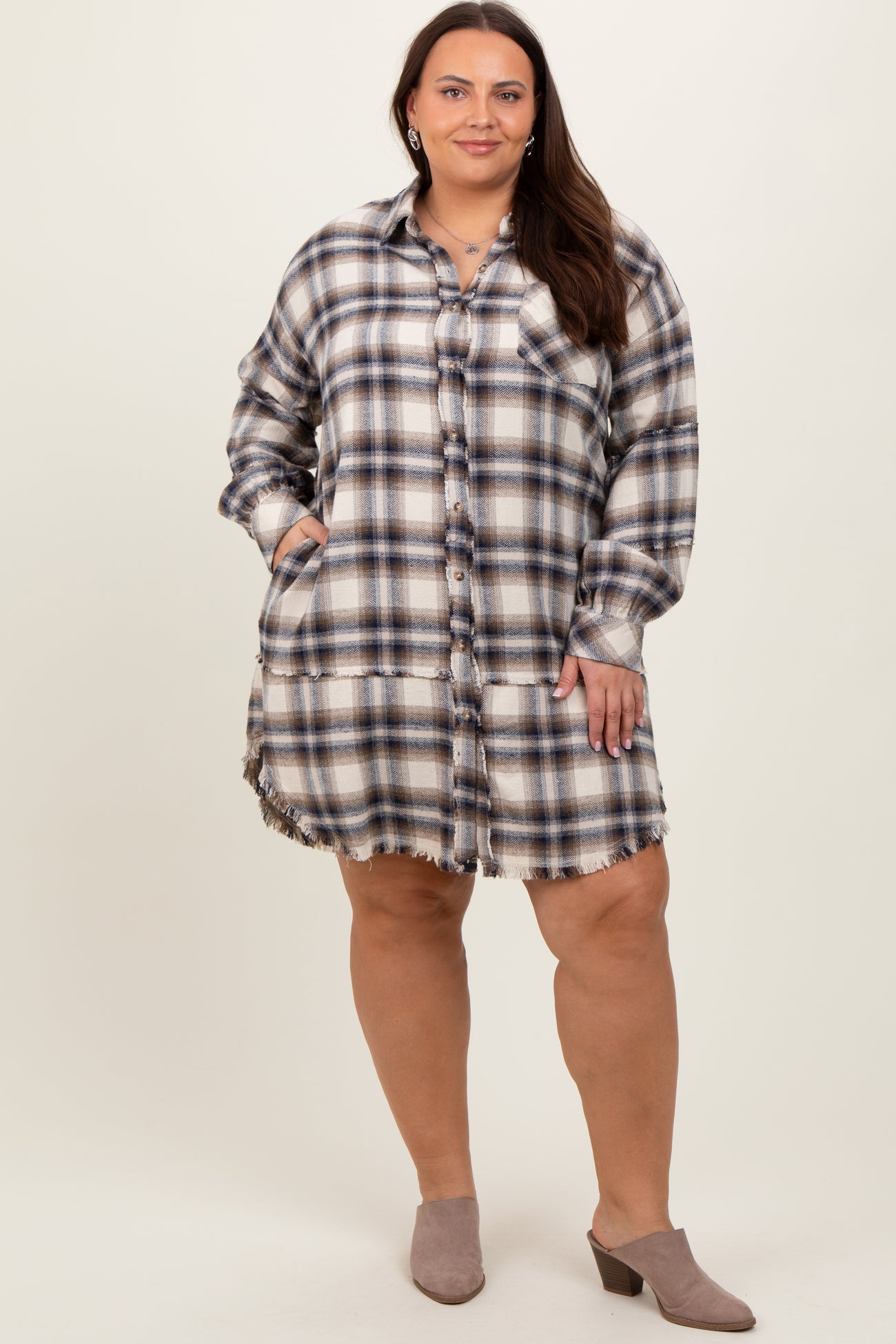 Taupe Plaid Button Down Raw Hem Plus Maternity Dress