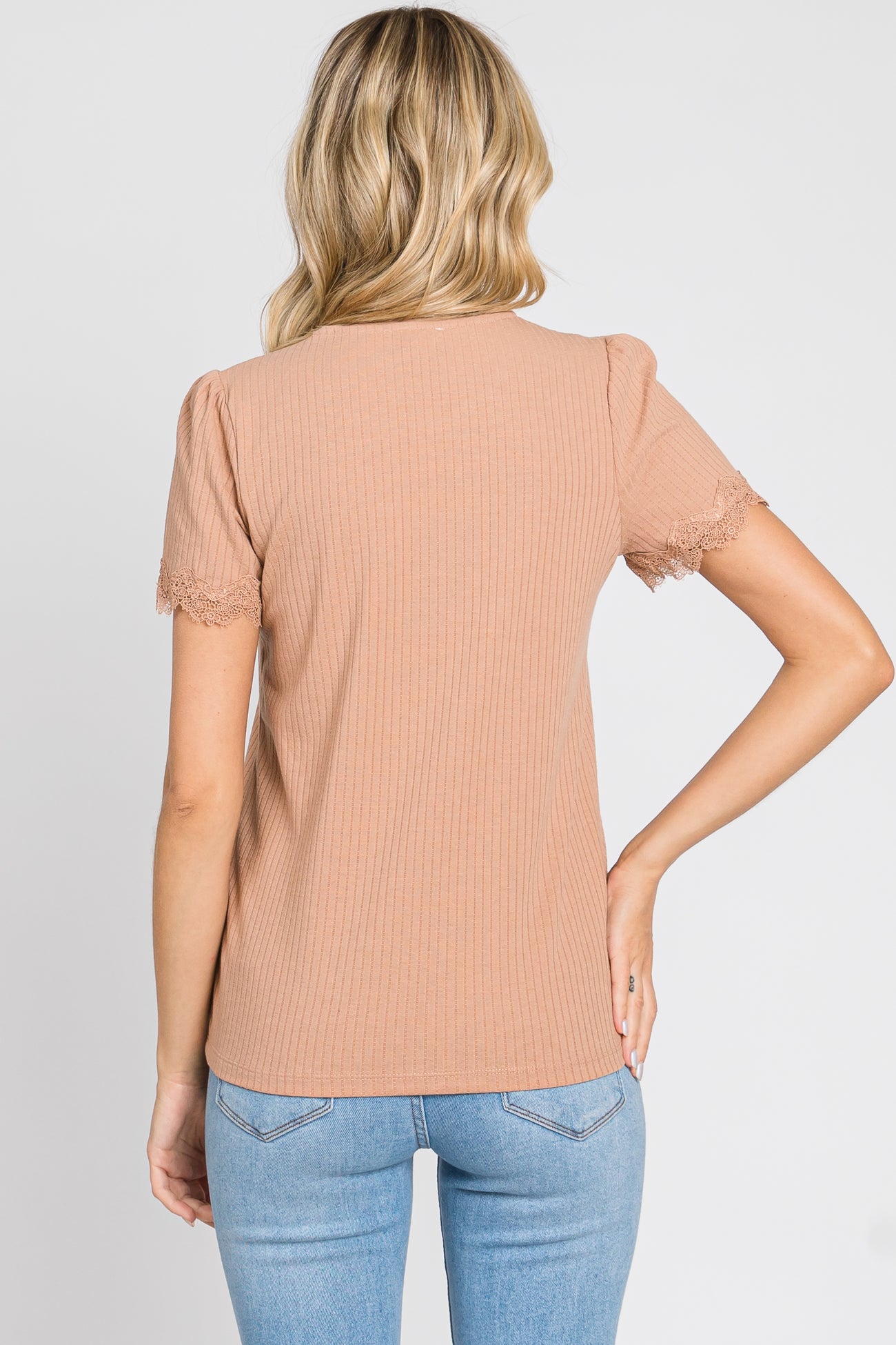 A ribbed top with a rounded neckline and short sleeves with lace trim.