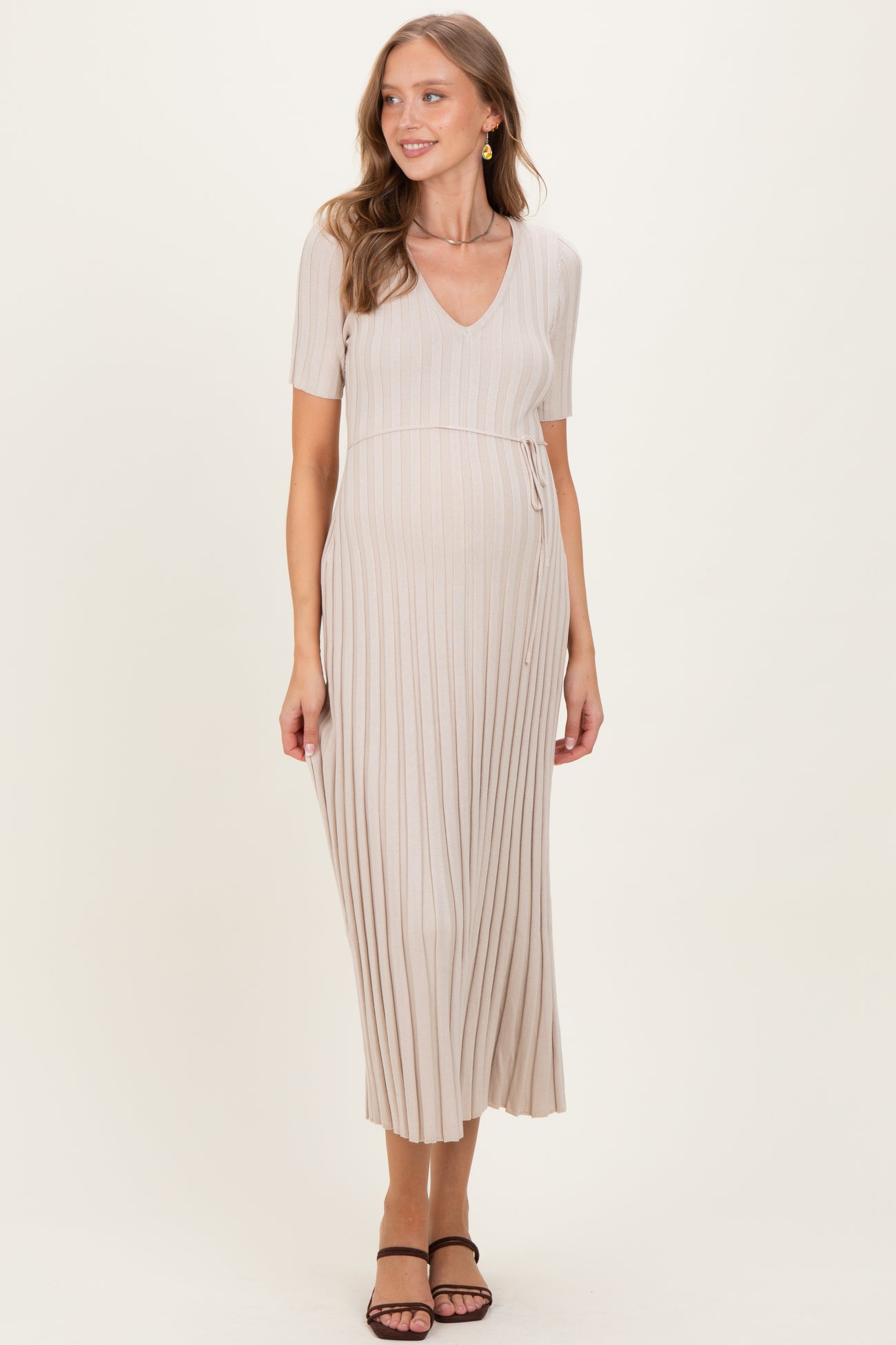 Effortlessly stylish and ultra-comfortable, this ribbed short sleeve maternity knit maxi dress is designed to grow with you throughout your pregnancy. The soft, stretchy fabric gently hugs your curves while offering plenty of room for your bump, and the classic maxi silhouette ensures all-day comfort. Perfect for any occasion, this dress easily transitions from day to night — just add your favorite accessories and shoes. Whether you’re running errands or attending a special event, you’ll feel confident and chic in this must-have maternity essential.