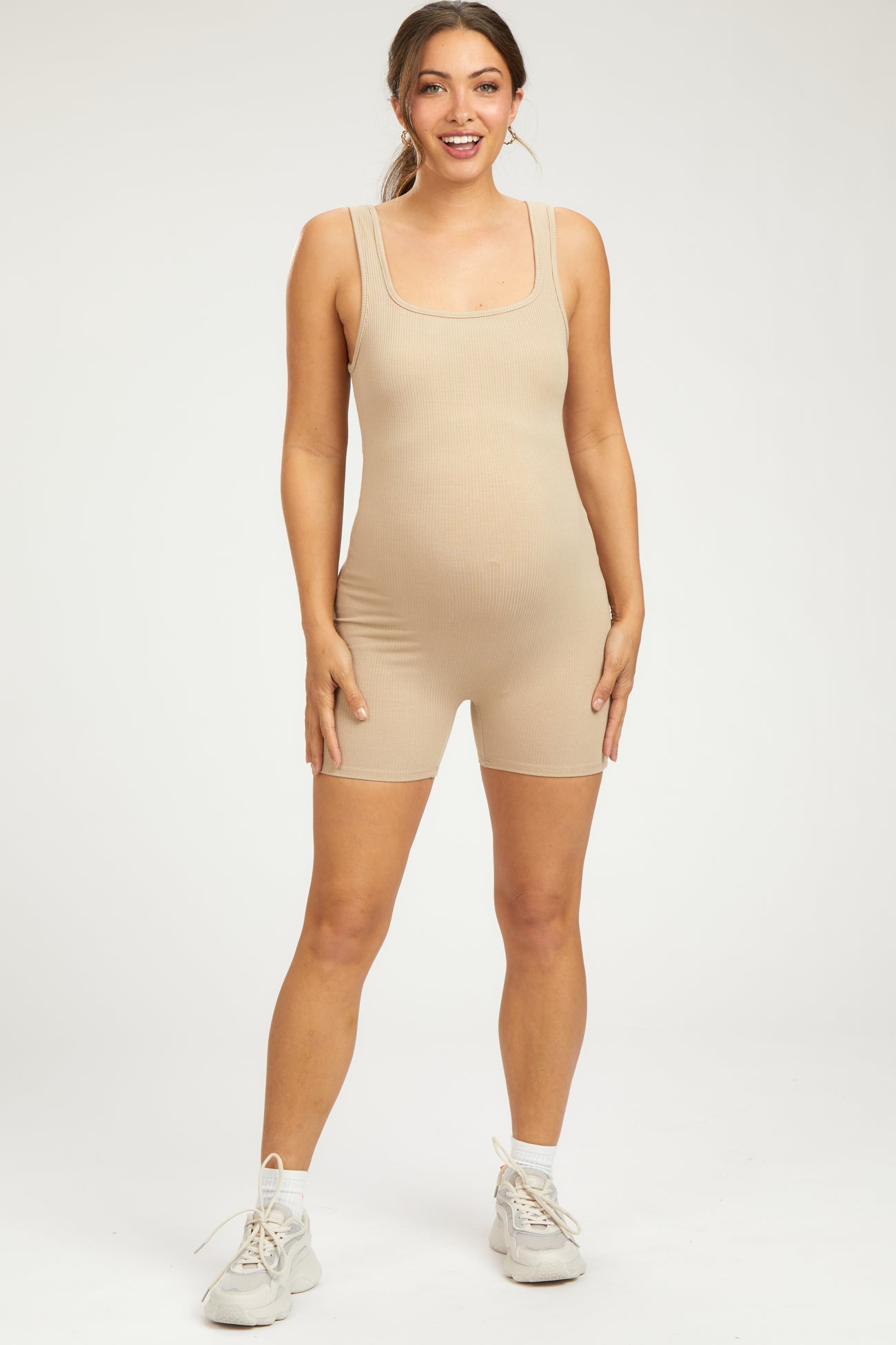 Taupe Ribbed Square Neck Sleeveless Maternity Romper