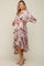 A floral satin maternity midi dress featuring a v-neckline, a wrap waist tie, long smocked accent sleeves, and an asymmetrical skirt with a flounce trim.