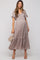 A solid satin maternity midi dress featuring short sleeves, a smocked top and a ruffle hem. Skirt is double lined.