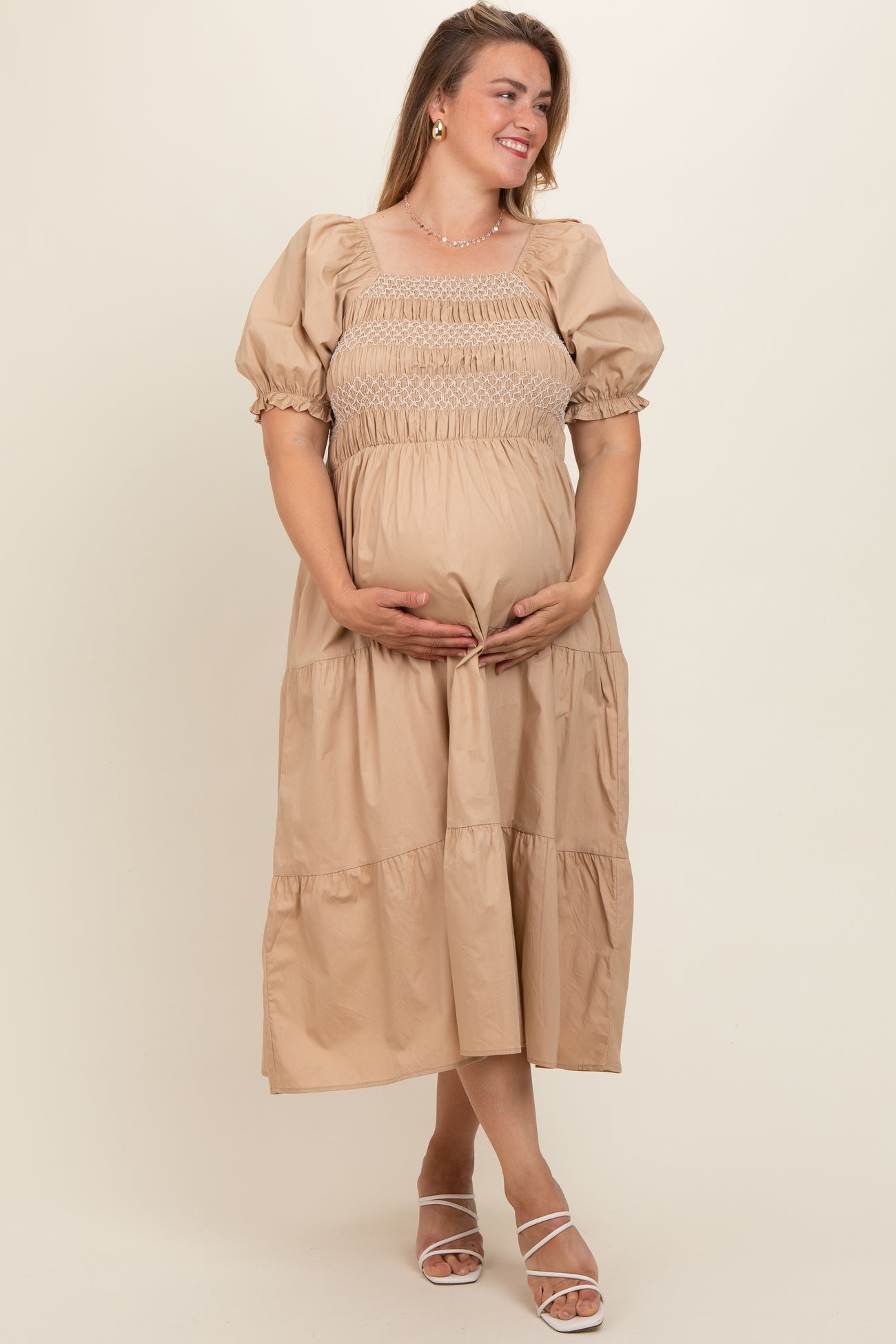 Taupe Smocked Square Neck Tiered Maternity Plus Midi Dress