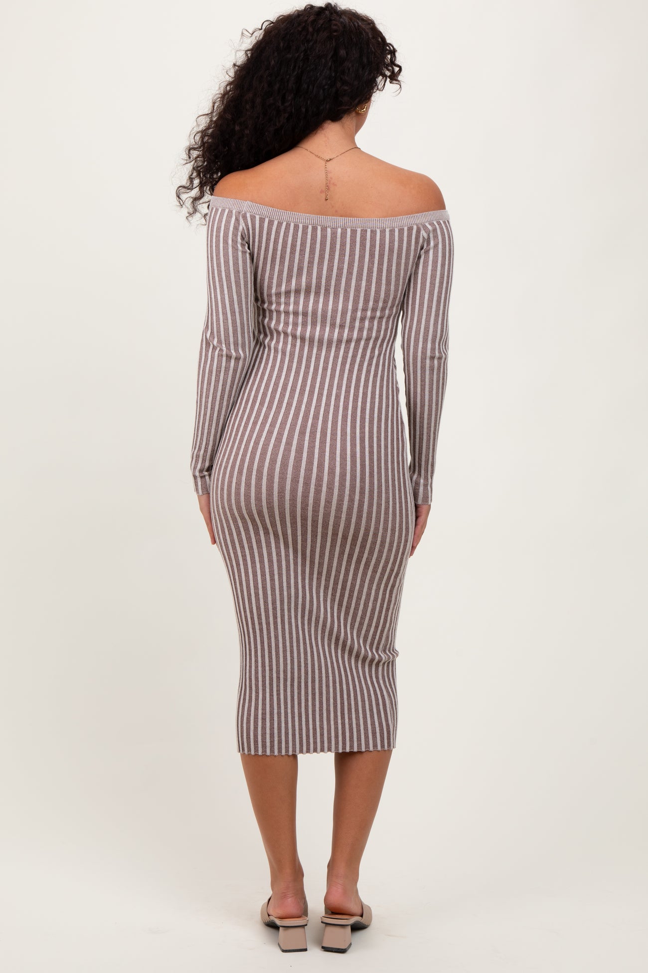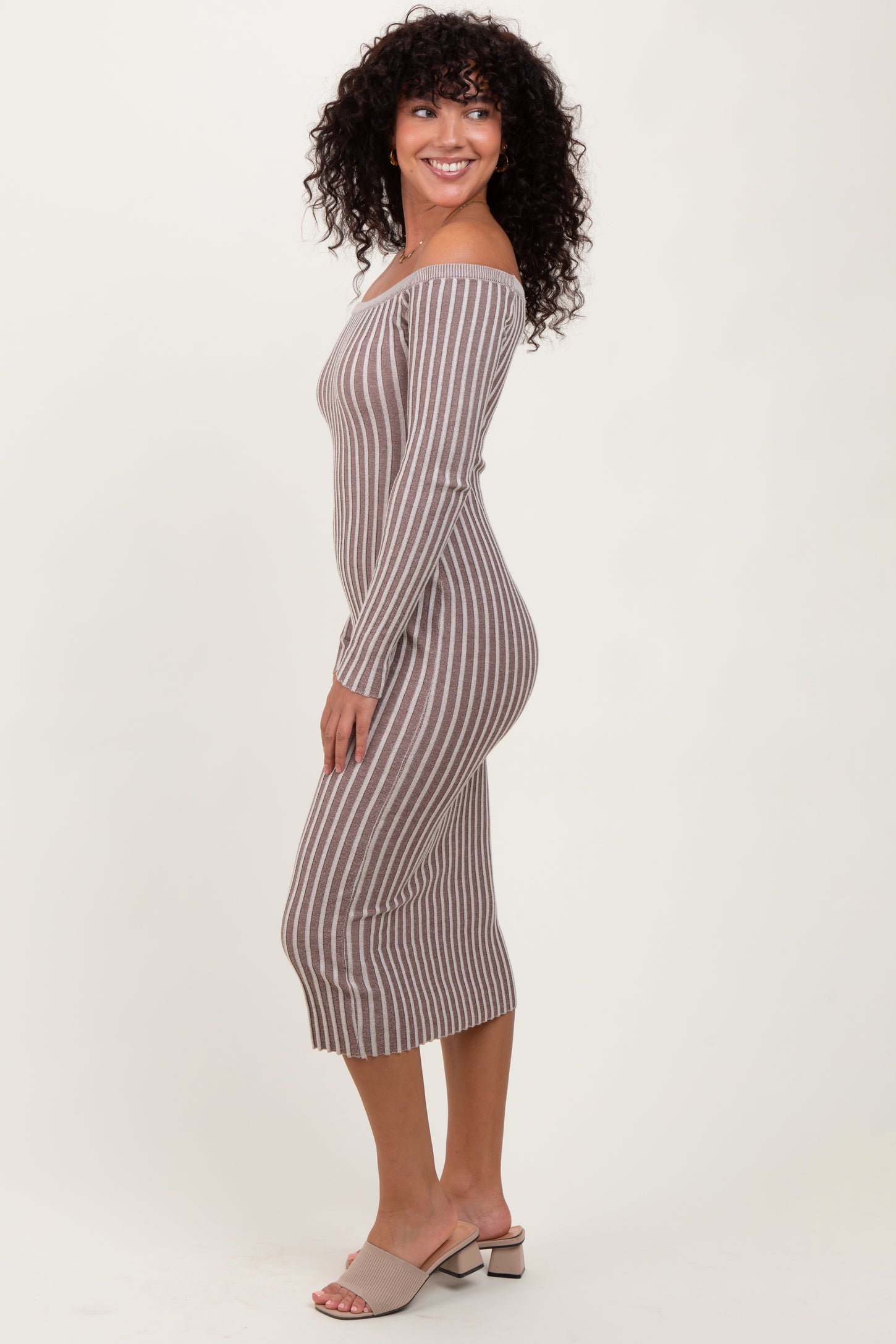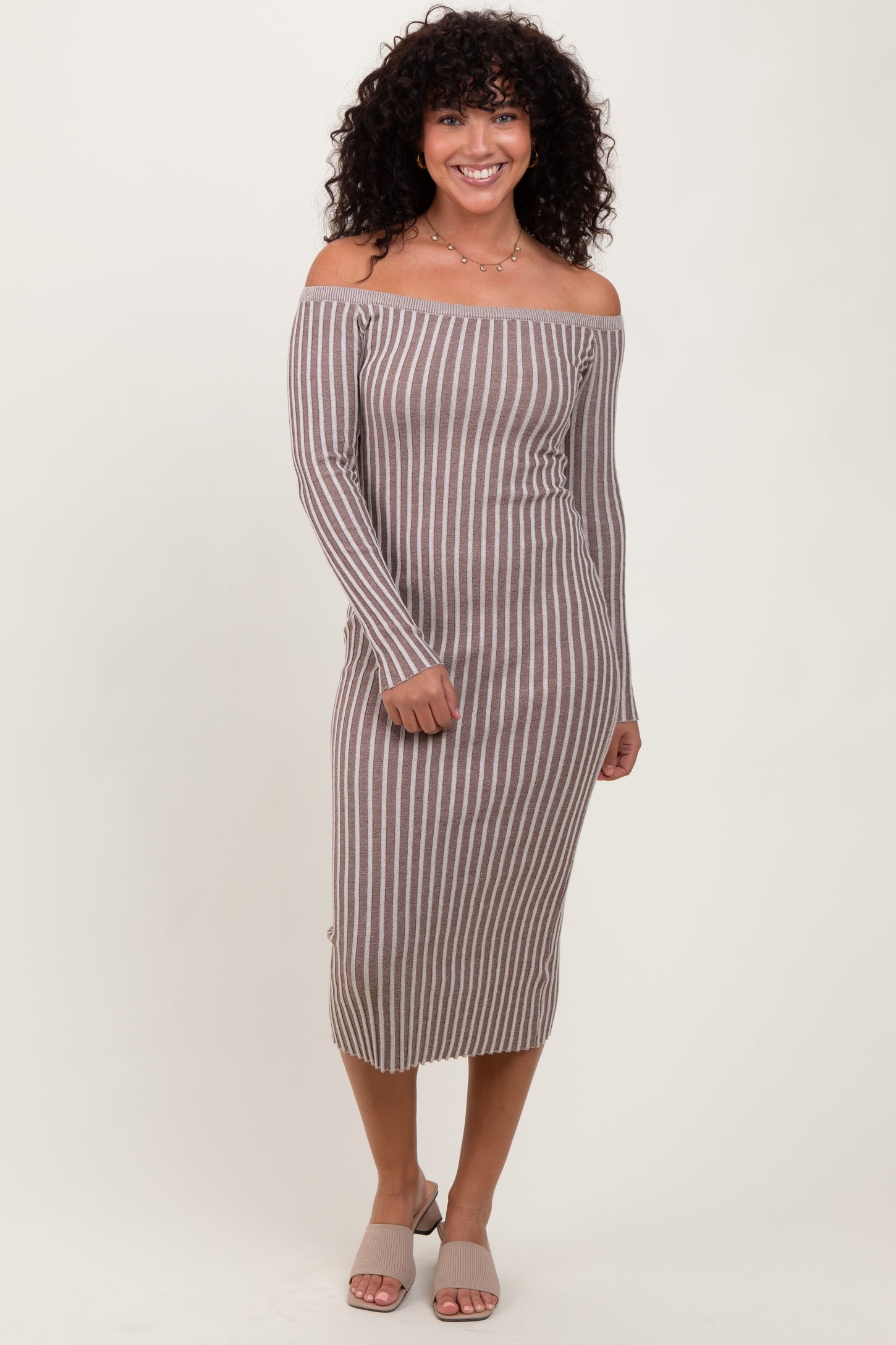 Taupe Striped Off Shoulder Midi Sweater Dress