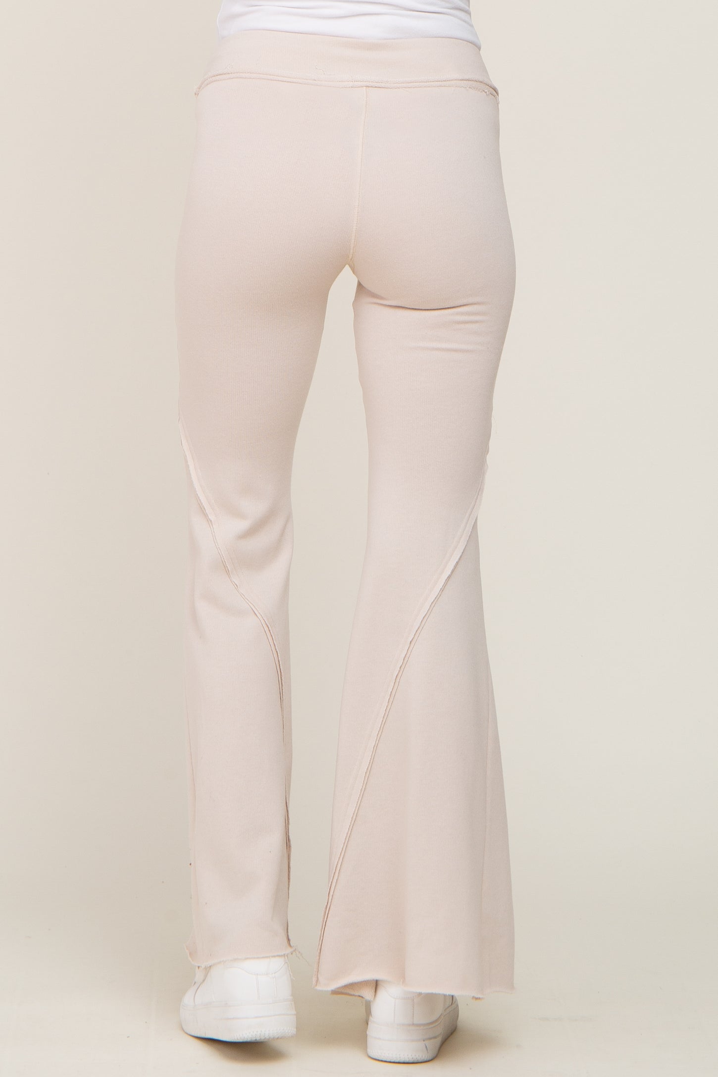 A pair of terry maternity lounge pants featuring flare legs, front slits and a raw hem.