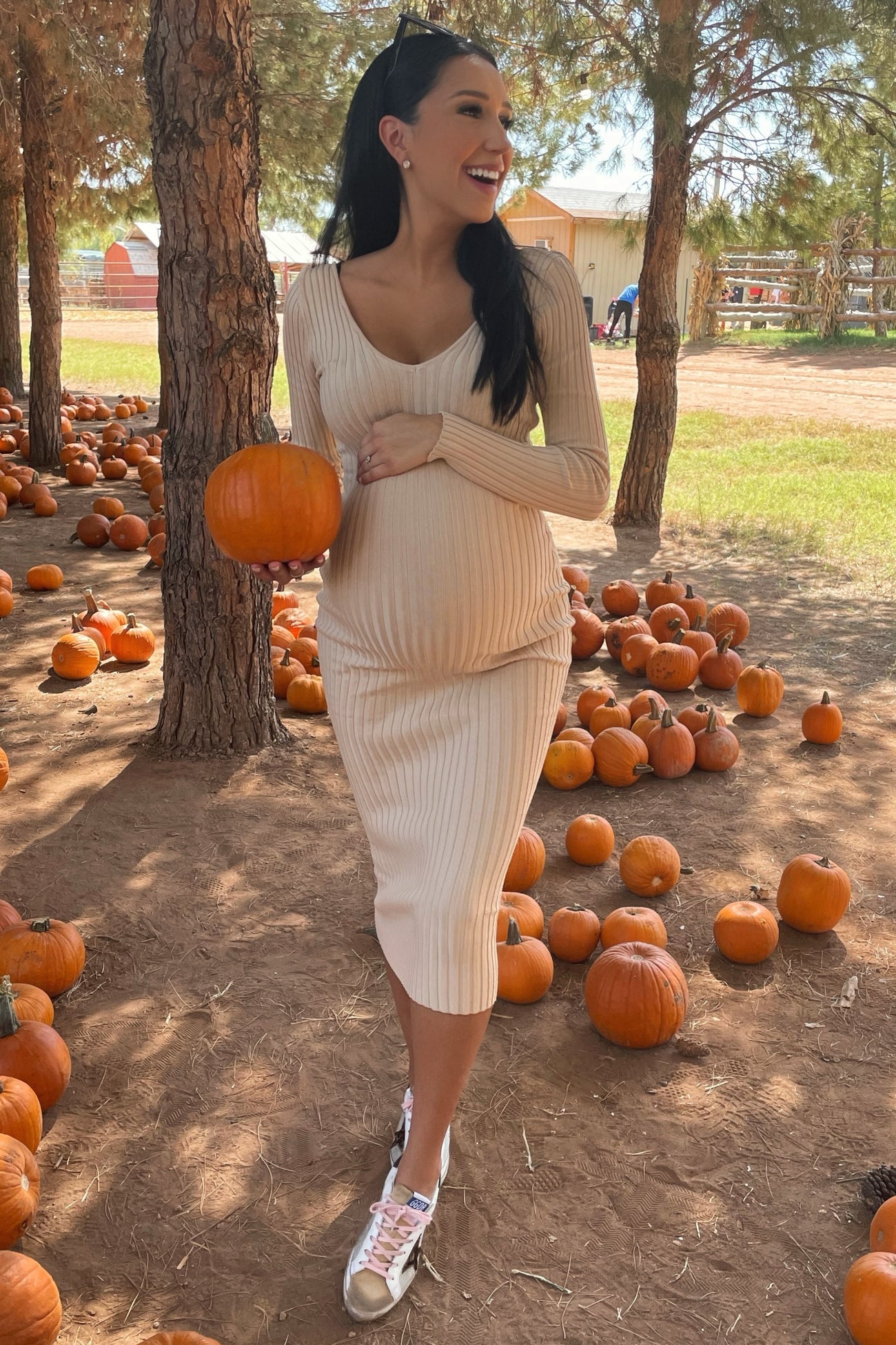 A solid hued fitted maternity maxi dress featuring long sleeves and a v-neckline.