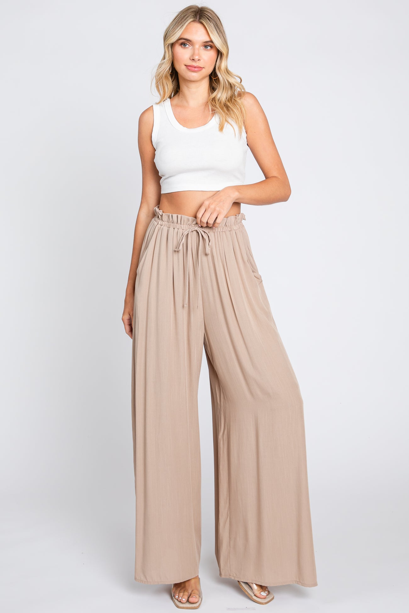 Details A pair of solid hued pants featuring wide legs, side pockets and a drawstring ruffle waistband. Content + Care