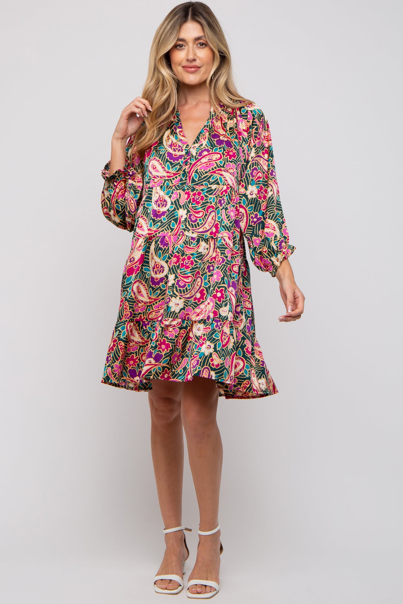 A floral print maternity dress featuring a split v-neckline with a button front, a tiered skirt and 3/4 length sleeves with a ruffle trim.