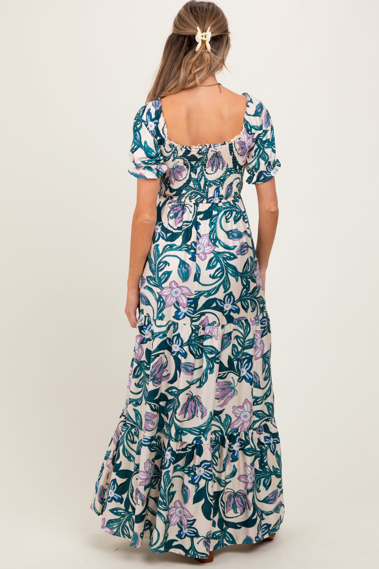 Teal Floral Smocked Front Tie Maternity Maxi Dress