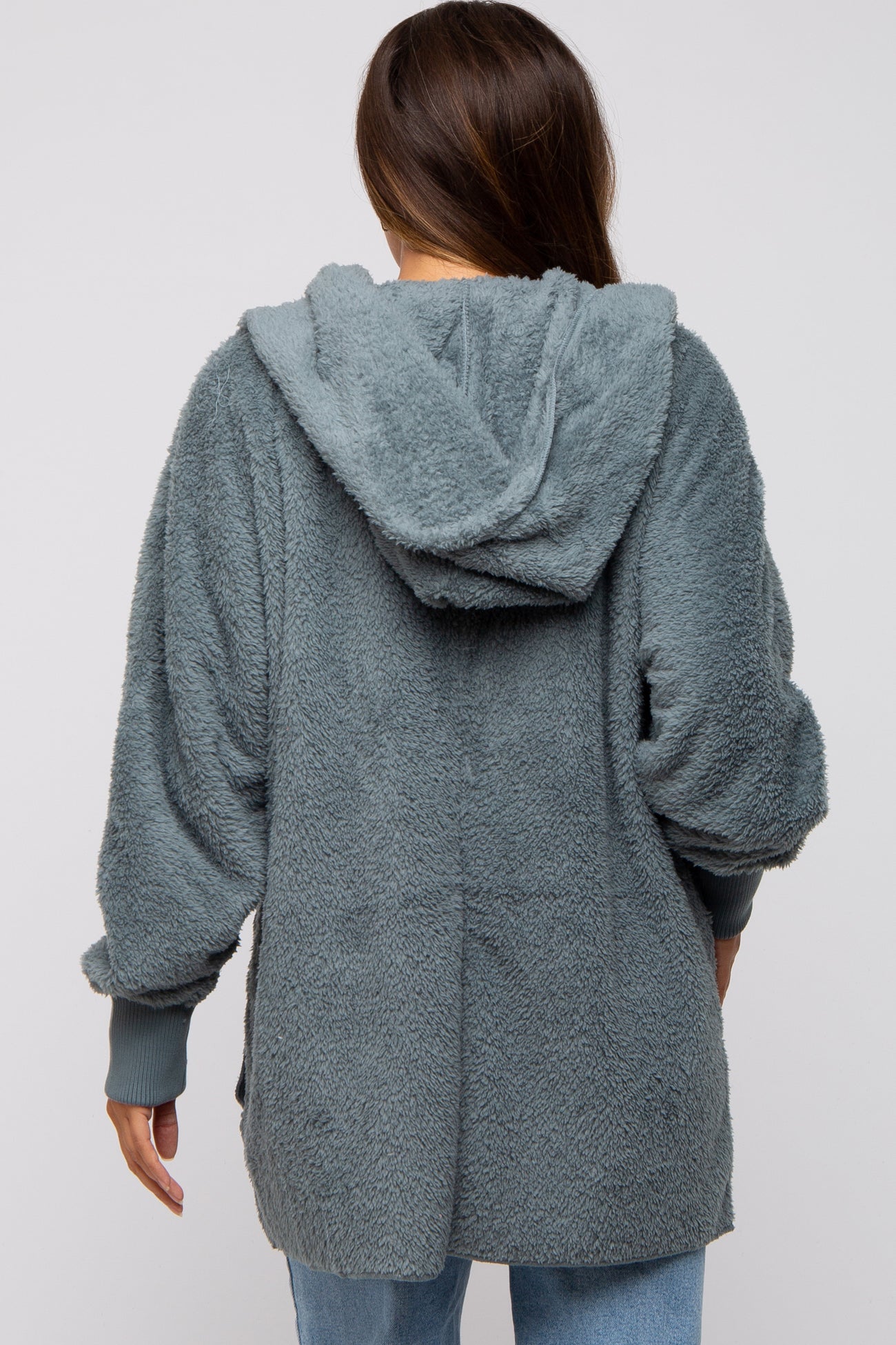 Teal Grey Fuzzy Hooded Long Sleeve Maternity Jacket