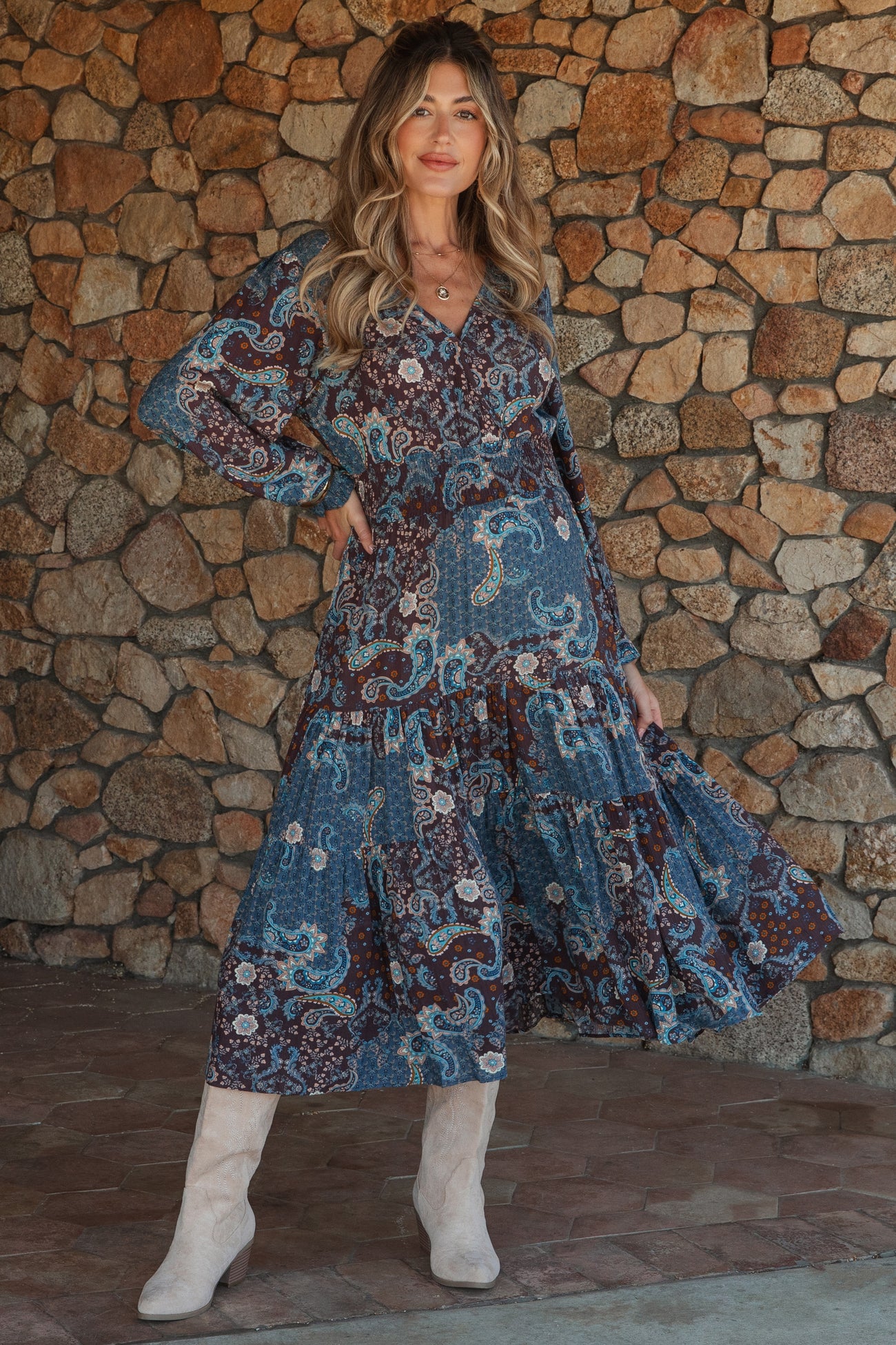 Add a vibrant touch to your maternity wardrobe with our Paisley Print Smocked Waist Tiered Midi Dress. Designed to flatter your growing bump, the smocked waist offers comfortable stretch while the flowy tiered skirt creates a breezy silhouette. The paisley print adds playful style, perfect for baby showers to brunch dates. Crafted from soft, lightweight fabric for all-day comfort, this dress easily pairs with sandals for a casual look or dressier shoes for special occasions. Embrace feminine elegance and effortless style throughout your pregnancy and beyond!