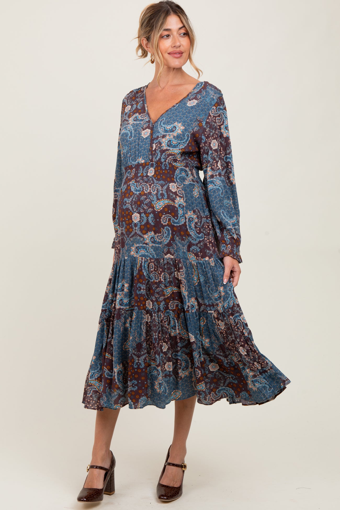 Teal Paisley Print Smocked Waist Tiered Maternity Midi Dress