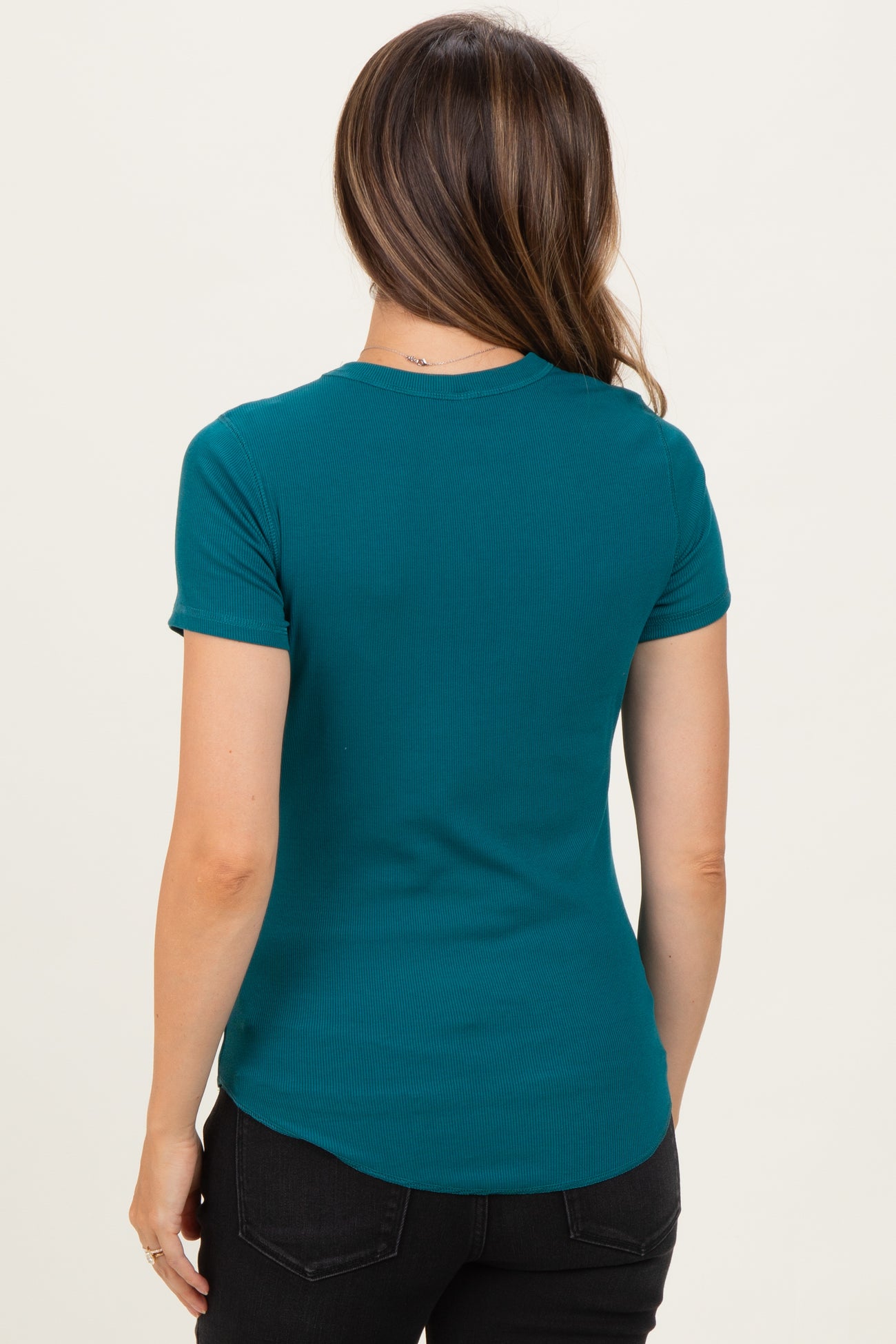 Teal Ribbed Short Sleeve Curved Hem Maternity Top