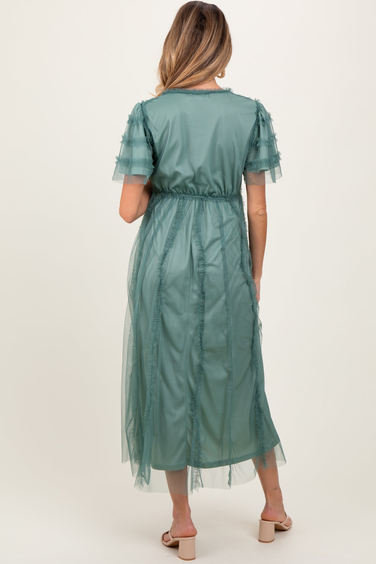 Teal Ruffle Accent Mesh Overlay Maternity Maxi Dress