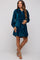 A velour maternity dress with front functioning buttons, long cinched sleeves, and front pockets.