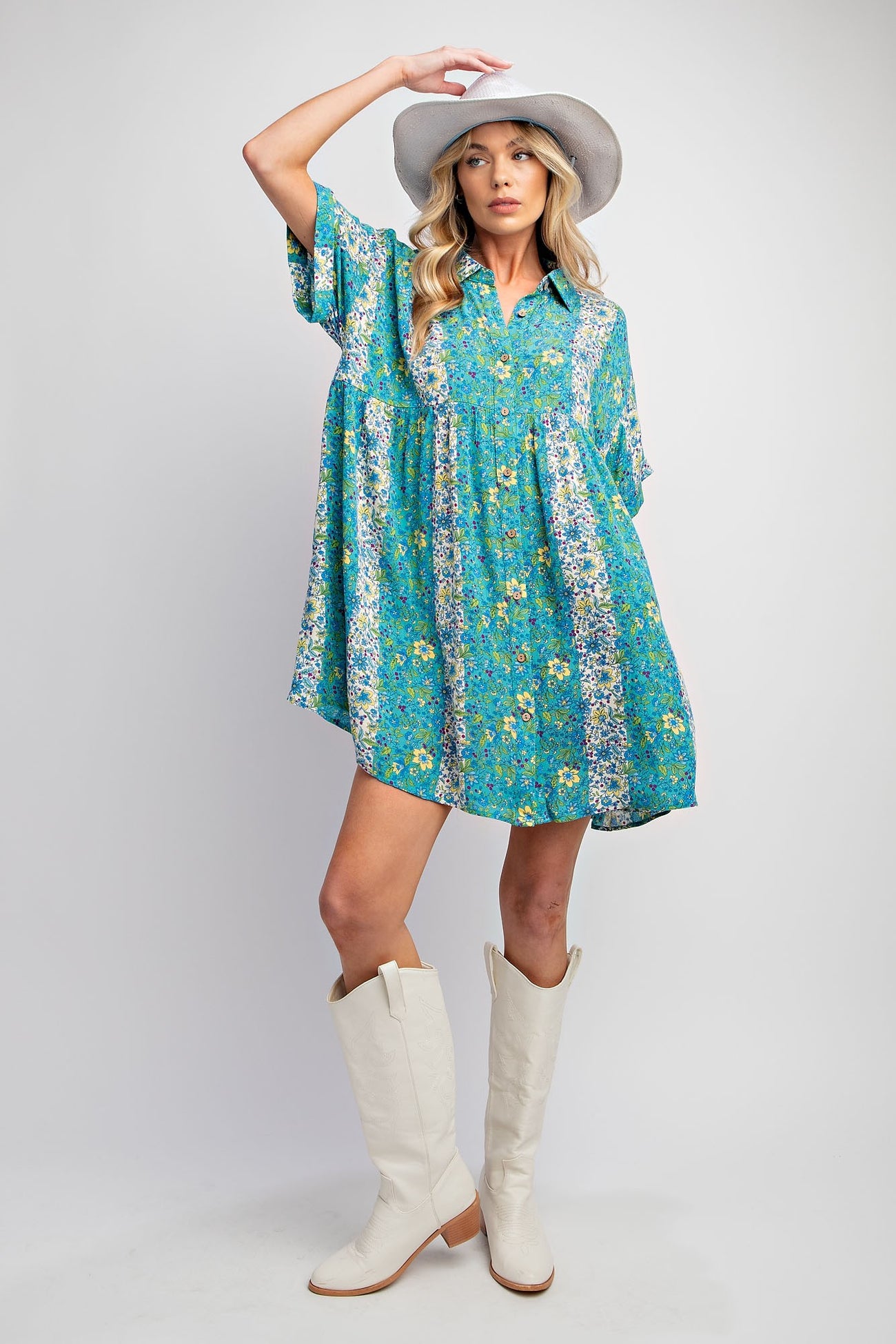 Details A printed short sleeve button down dress with a collared neckline and side pockets. Content + Care