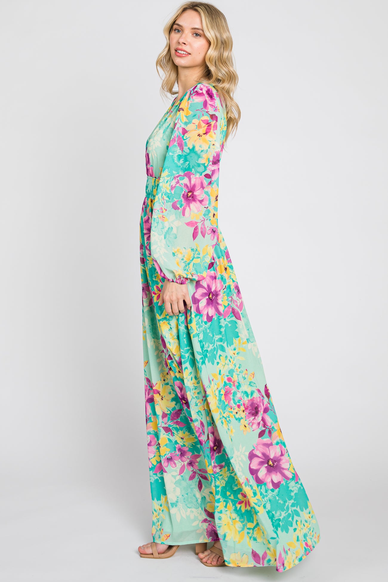 A floral print maxi dress featuring long puff sleeves, a v-neckline, side waist cutouts, and a smocked waist. Body is lined for coverage.