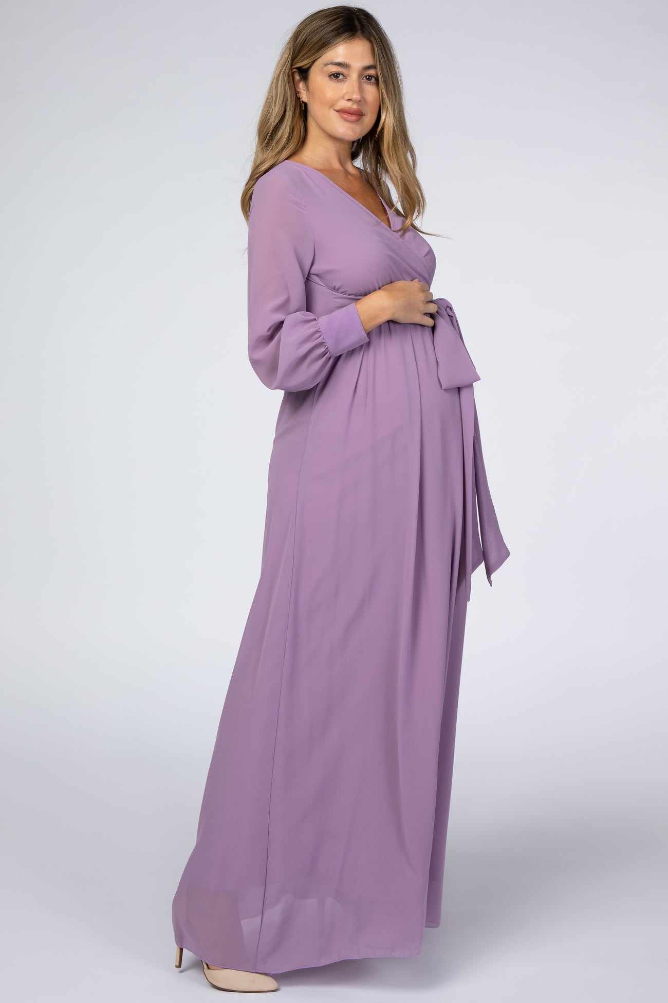 Violet Chiffon Long Sleeve Pleated Maternity Maxi Dress