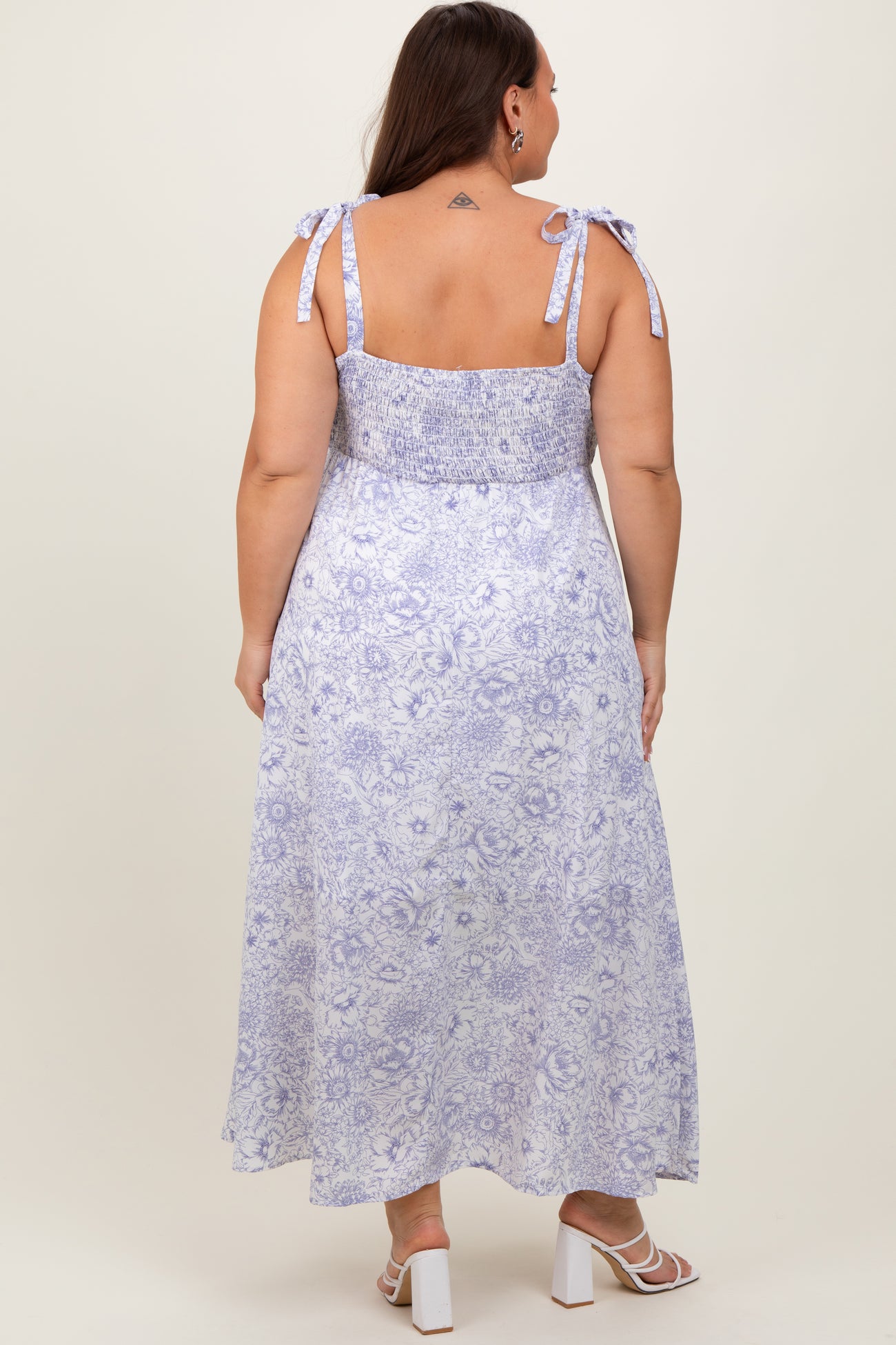 White Blue Floral Tie Strap Plus Maxi Dress