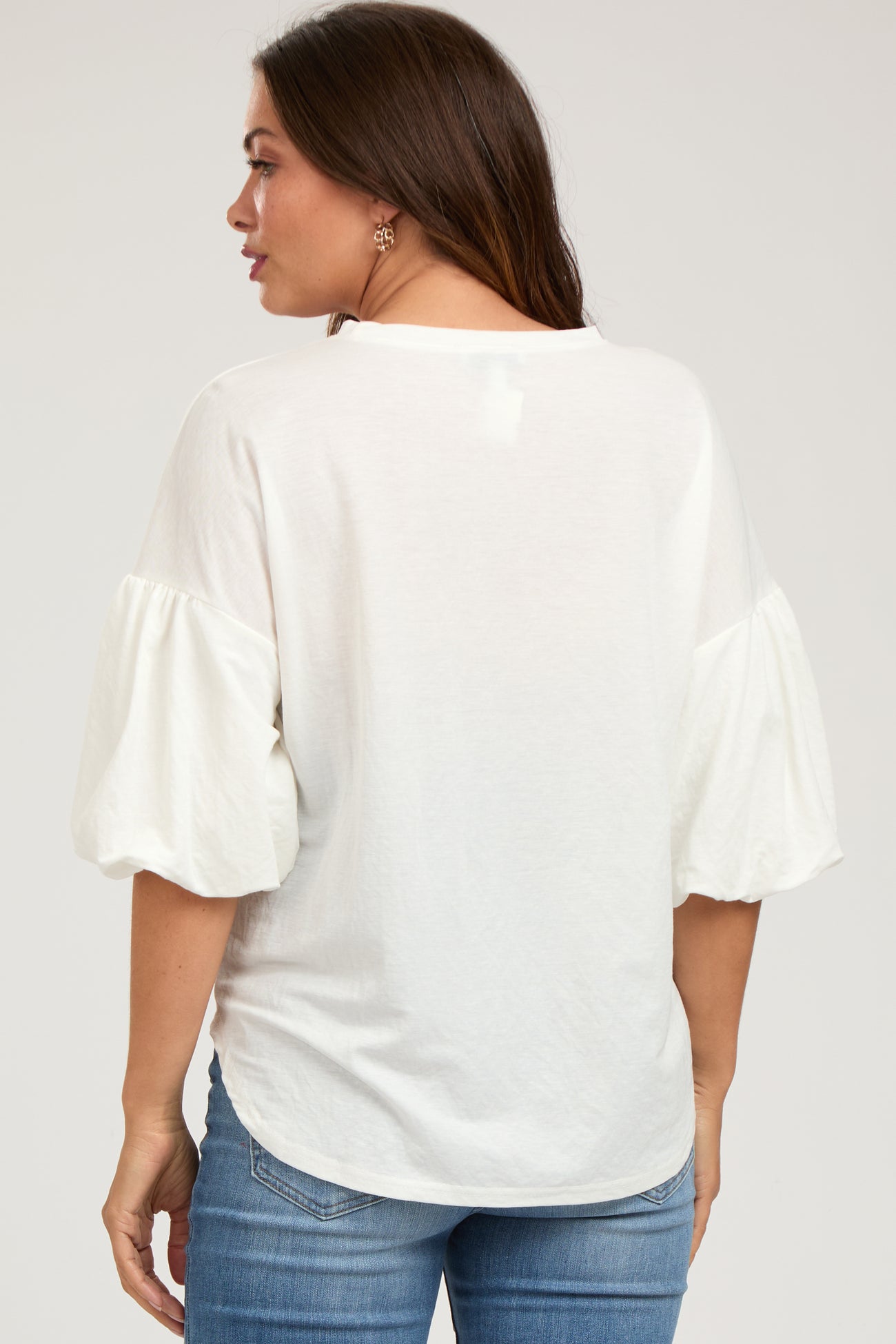 A solid maternity top featuring a rounded neckline and drop shoulder puff sleeves.