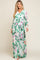 A floral print maternity maxi dress, featuring long sleeves with button closures, a wrap v-neckline, a cinched elastic waistline, a pleated back detail, a sash tie, and double lining to prevent sheerness.