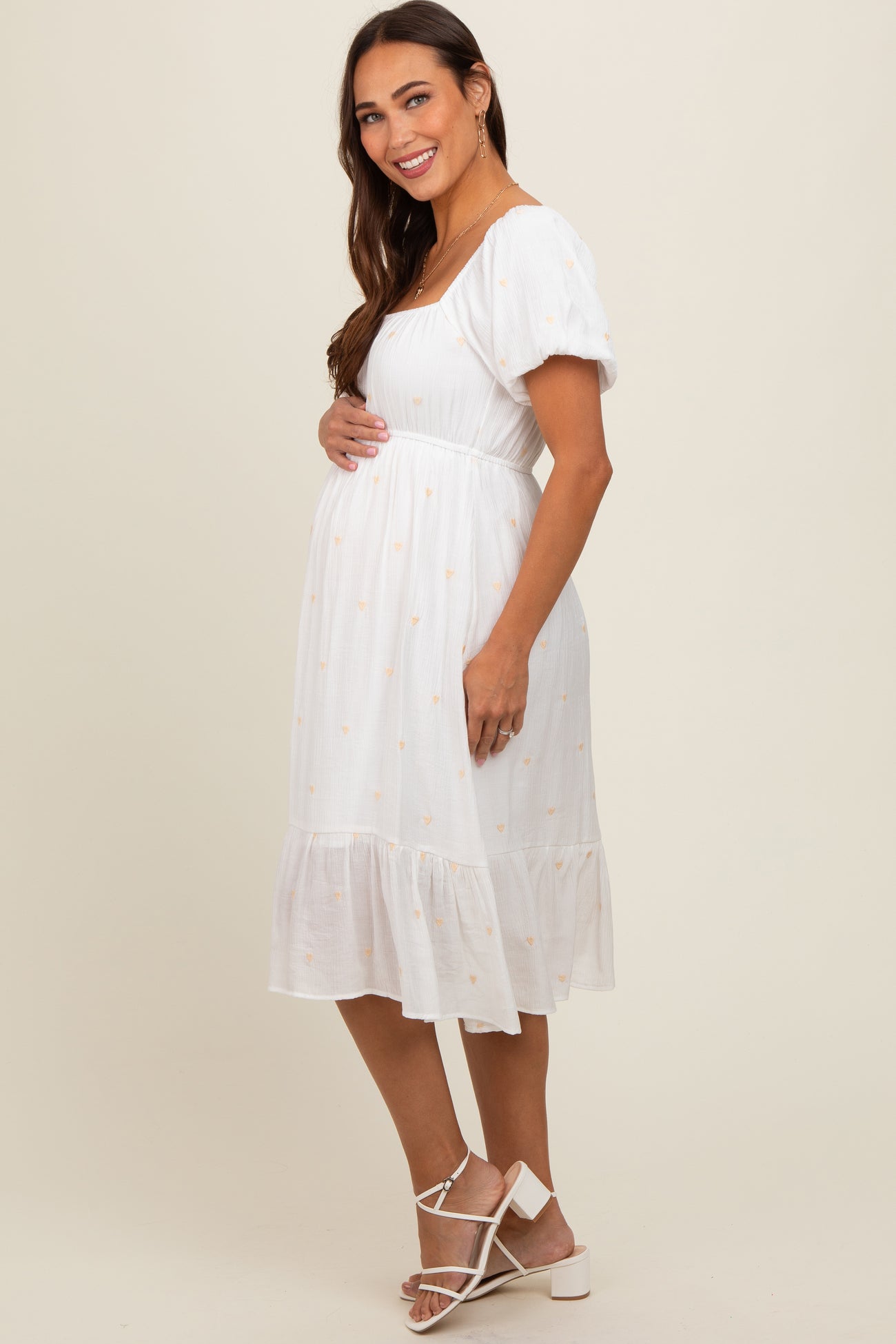 White Heart Embroidered Short Puff Sleeve Maternity Midi Dress