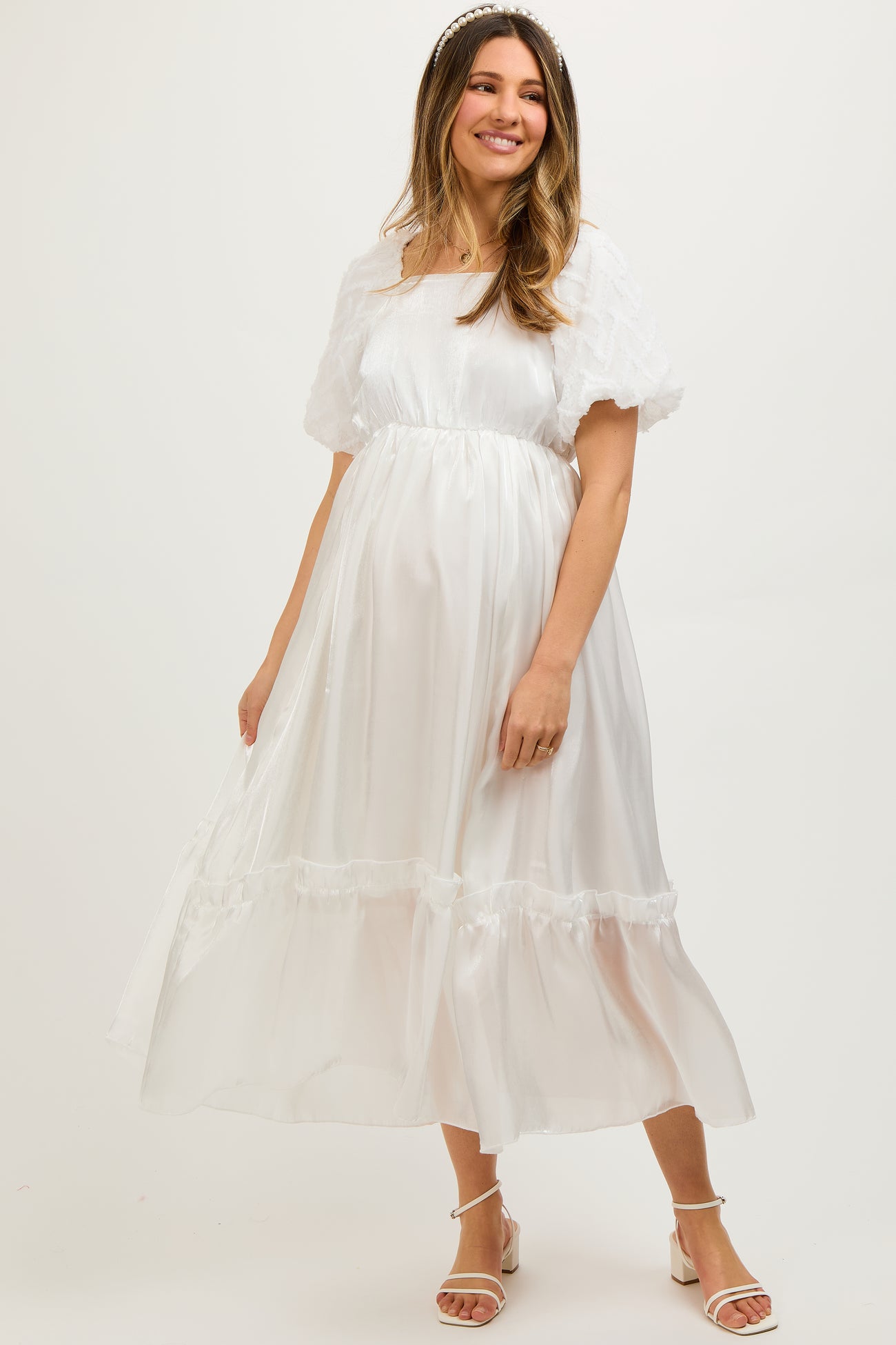 White Iridescent Textured Puff Sleeve Maternity Midi Dress