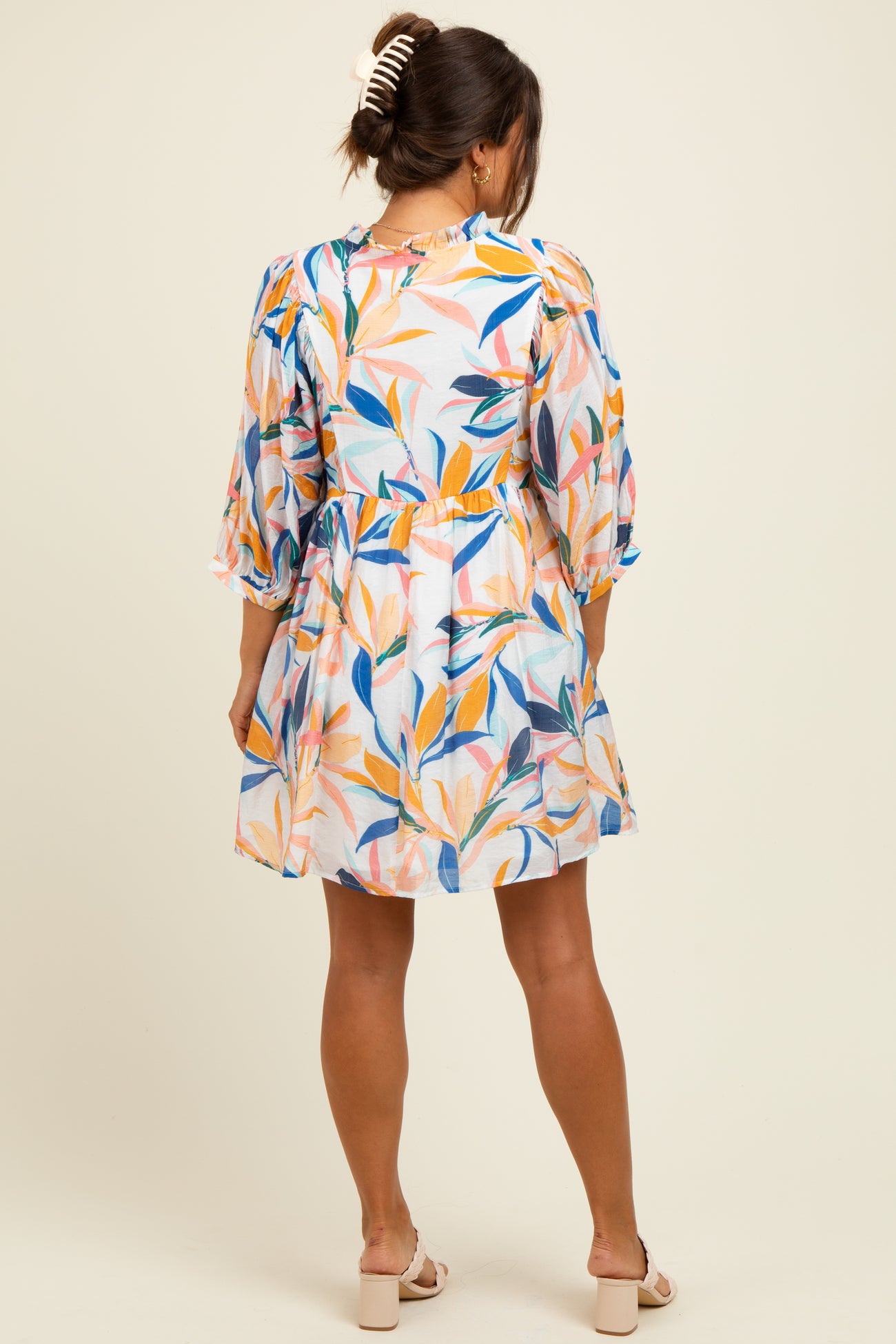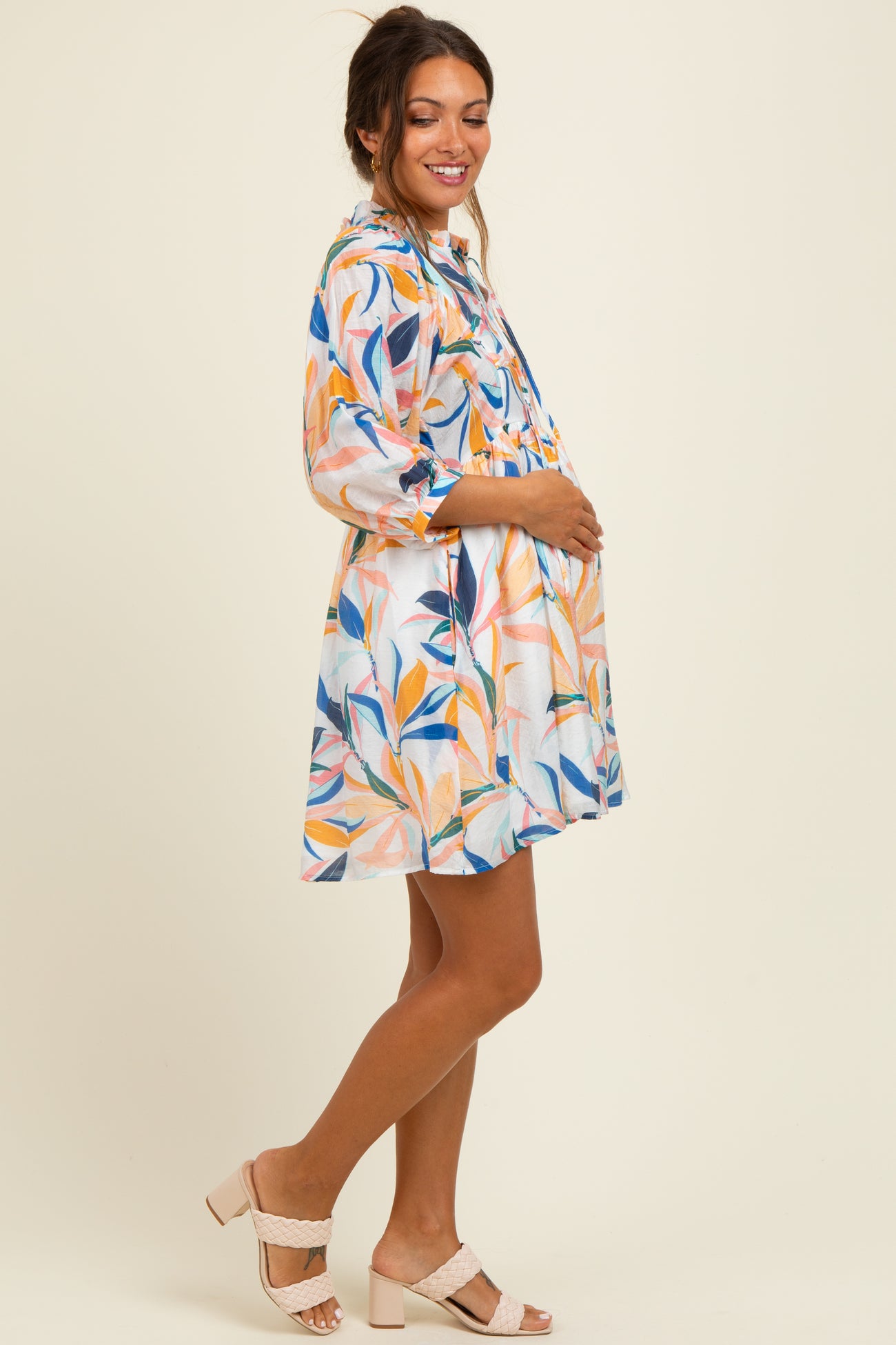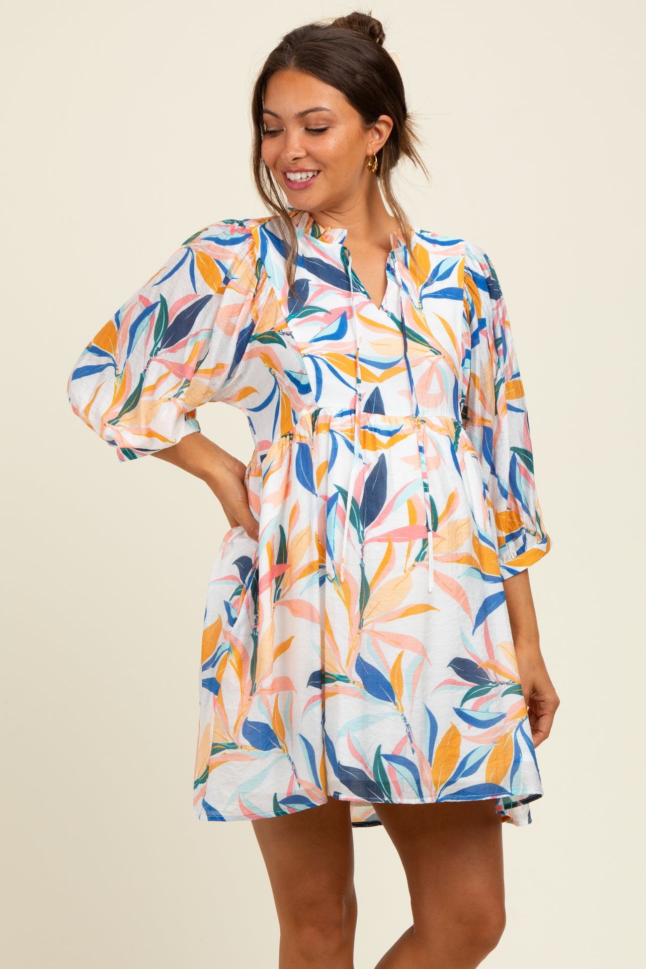 White Leaf Print Front Tie 3/4 Sleeve Maternity Dress