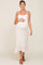 An open knit crochet maternity dress featuring adjustable straps and a scoop neckline. Dress is lined.